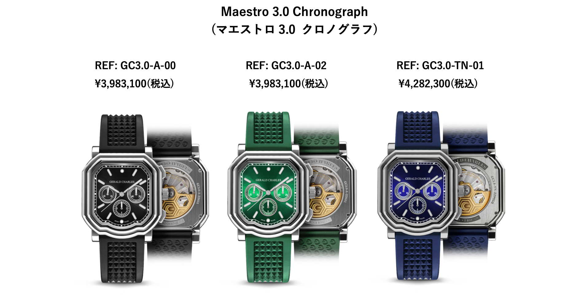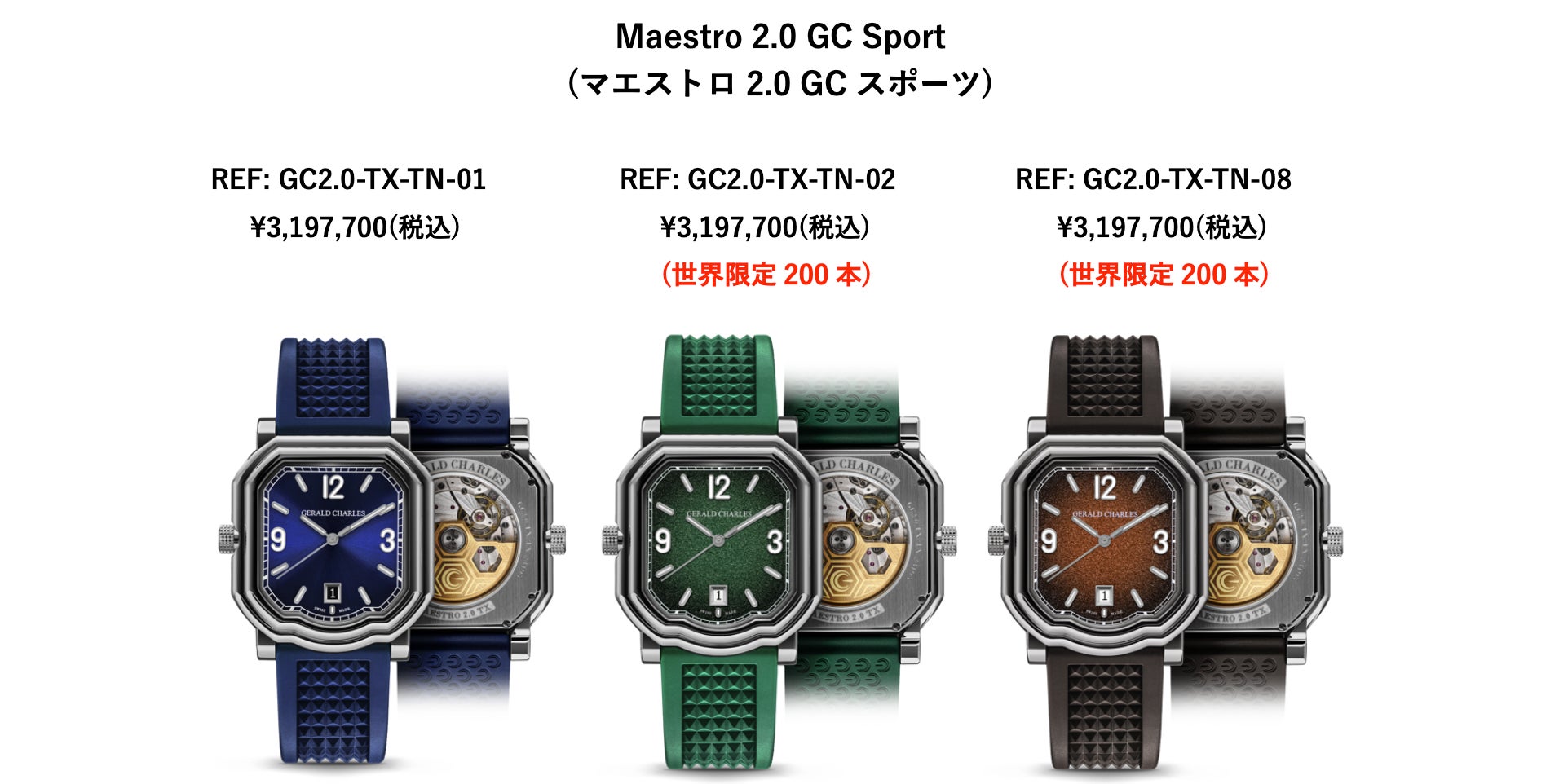 Maestro2.0 GC Sport (マエストロ2.0 GCスポーツ)は、青文字盤、緑文字盤、クレイ文字盤の3モデルが並びます。ケースはチタン、ストラップはクル・ド・パリ仕上げが施されたラバー仕様のみとなり、文字盤の色と同色のストラップが純正となります。緑文字盤とクレイ文字盤のモデルは世界限定200本となります。