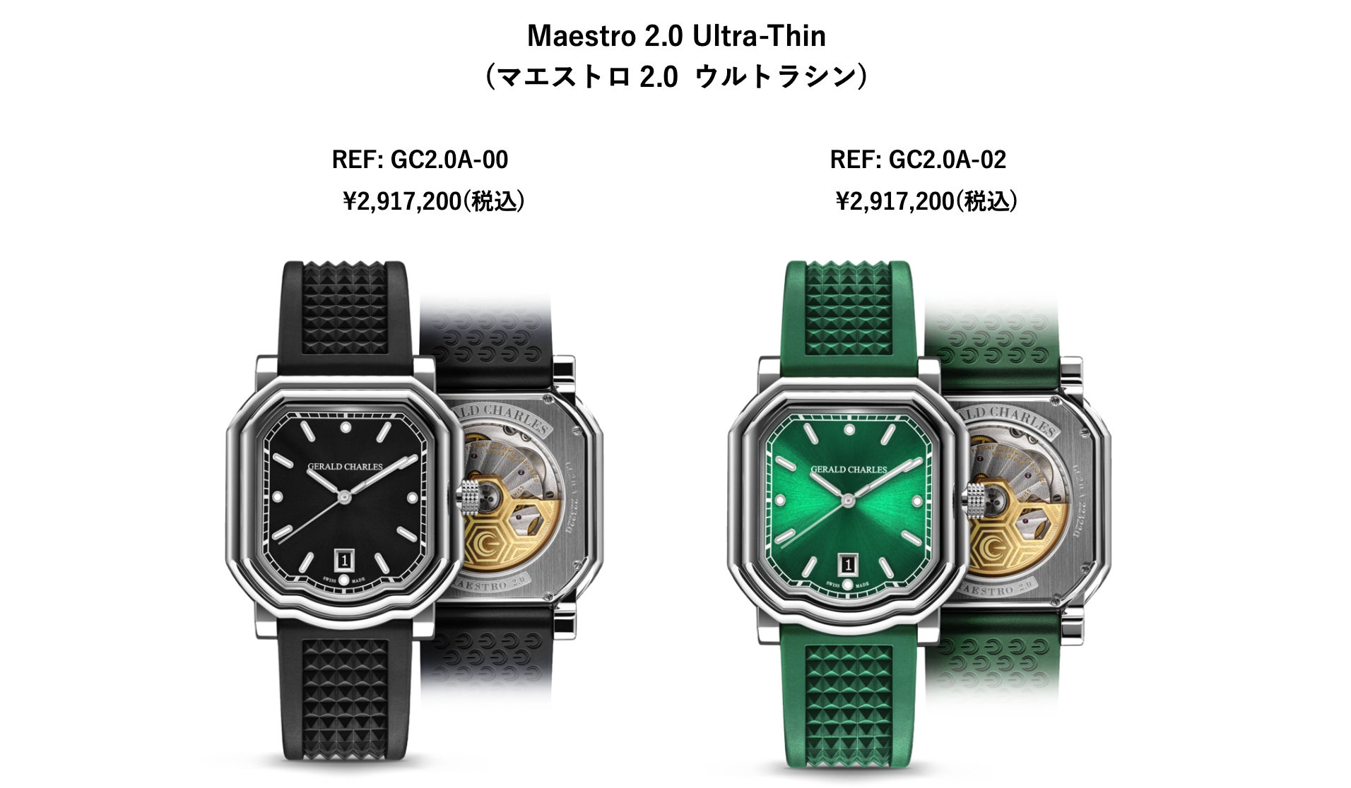 Maestro 2.0 Ultra-Thin (マエストロ2.0 ウルトラシン)は、黒文字盤と緑文字盤のステンレス・スティールタイプと、青文字盤と茶色文字盤の18Kローズゴールドタイプの計4モデルが並びます。ストラップはクル・ド・パリ仕上げが施されたラバー仕様のみで、文字盤と同色のストラップが純正となります。ケース径は39mmで仕上げられており、男女を問わずクラシックな装いからスポーツの用途まで幅広く着用できるジェラルド・チャールズを代表するレギュラーコレクションです。