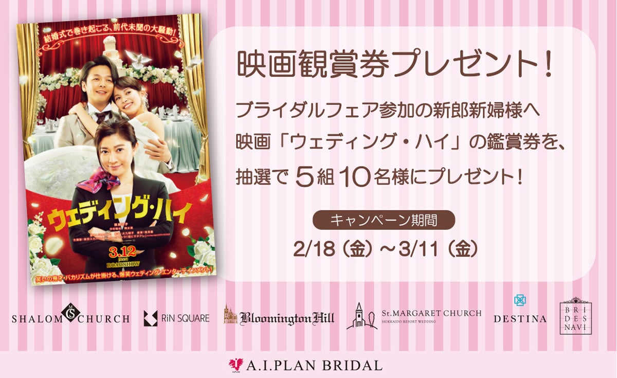 2/18(金)~3/11(金)の期間中、藻岩シャローム教会、リンスクエア、ブルーミントンヒル、セント・マーガレット教会のブライダルフェアにお越しのお客様と、DESTINAでブライダルフェアのご予約かフォトプランをお申込み、またはブライズなびにご来店のお客様の中から、抽選で合計5組10名様に、映画「ウェディング・ハイ」の観賞券をプレゼントいたします!