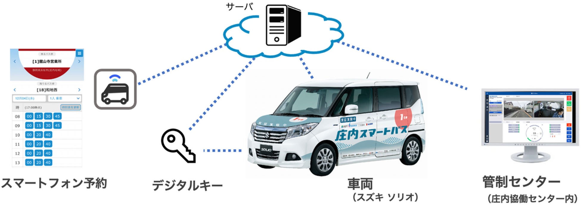 本実証実験では、自動運転サービスの実用化により地域住民の移動の利便性向上を図ることを目的に、地域住民や自治会関係者らを乗客として、運転支援機能や遠隔監視システムを搭載したスズキの小型車「ソリオ」を使った実験車両2台が、発着地点である浜松市内の庄内協働センターから折返し地の白洲町を結ぶルート(片道約3.4キロメートル)を走行しました。2019年12月に実施した第二回目の実証実験よりも一回の走行距離が長い約2.1キロメートルの区間で、ライダーセンサーなどのより高度な技術を用いて、レベル2での自動運転による走行を行いました。また、スマートフォンの予約アプリで受け付けた予約情報を「Dispatcher」を経由して車両に送信し車載システムと連携することで、予約者がスマートフォンを持って車両に近付くだけで車両のドアが開く仕組みを実現しました。