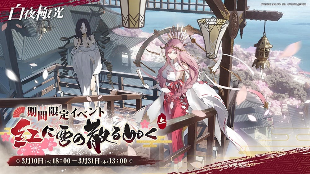 幻想的かつユニークなストーリー、美麗なグラフィック、豪華声優陣による個性豊かなキャラクター等で話題となり、ローンチとともにApp StoreとGoogle Playでランキング1位に輝き、さらに現在登録者数1600万人を突破している『白夜極光(びゃくやきょっこう)』。2022年3月10日より、【紅に雪の散る如く・上】がスタートします。このイベントでは、以前に大好評だった【あの日の雲桜】に近い地域を舞台に、疑念や悲哀、そして静と動が織りなす“別れの物語”が展開されます。またイベントに【上】と銘打たれていることからもわかるように、本シナリオは1回では終わらない壮大なストーリーを予定しています。はたして、オリエンタル感が漂う風光明媚な土地で、光霊たちを待つ試練とは?