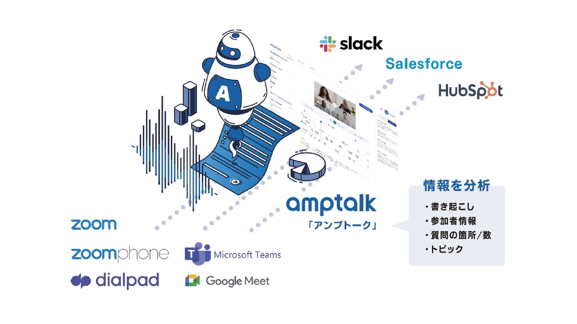 「アンプトーク」は、IP電話やテレビ会議システムなどあらゆるコミュニケーションツールと連携し、オンライン商談や通話を自動で書き起こし・要約・解析し、Salesforce / HubSpot / Slackに自動出力することで、オンライン商談を自動化・可視化します。