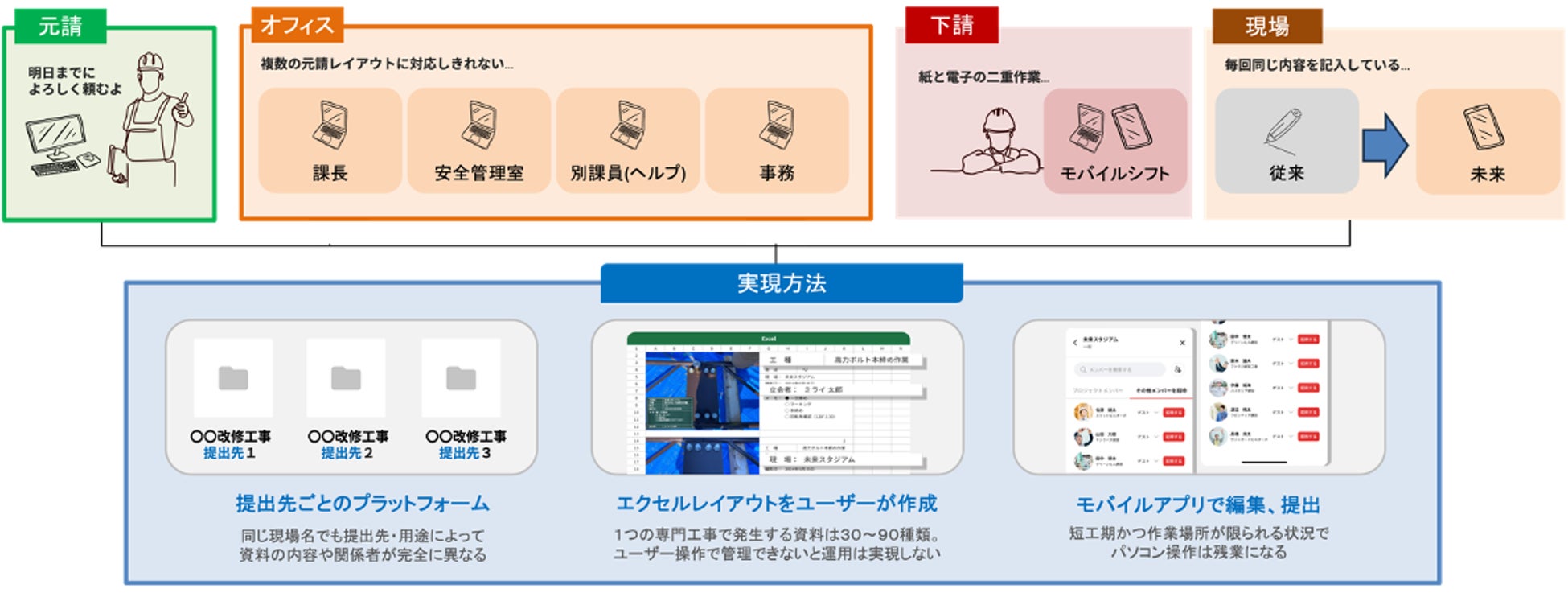 専門工事会社によって千差万別に異なる報告書のレイアウトやワークフローに対応できるように、PCで作成しているエクセルの報告書を、そのままアプリでの運用に切り替えられるようにします。