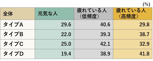 タイプ別の疲労度合を見ていくと、元気な人の割合はタイプAは29.6%、タイプBは22.0%、タイプCは25.0%、タイプD19.4%となっており、運動習慣があるタイプA、タイプCの人が元気な人が多い傾向にある。