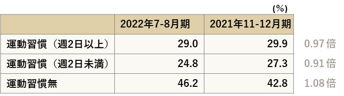 2022年の運動習慣者は29.0%、運動習慣者予備軍(運動習慣週2日未満)は24.8%、運動習慣が無い人は46.2%という結果となった。2021年と比較すると運動習慣者は0.97倍と微減傾向にある。日常の活動量がある人は24.4%となっており、2021年と比べ1.06倍と微増している。