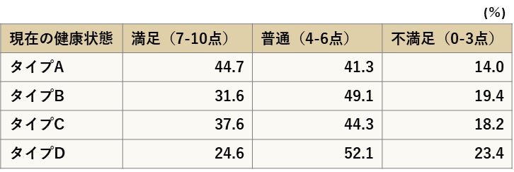 タイプ別の健康満足度を比較すると、満足(7-10点)している人は、タイプAが44.7%、タイプBが31.6%、タイプCが37.6%、タイプDが24.6%となっており、運動習慣・活動量があるタイプAは健康満足度も高い結果になっている。