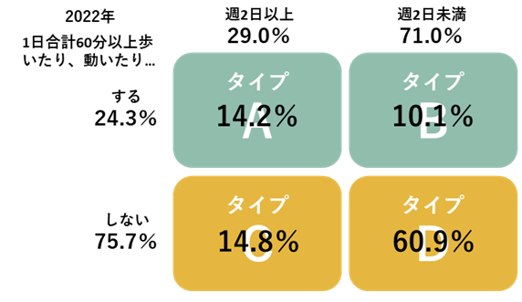 運動習慣を図表3の基準でタイプ別で状況を見ていくと、2022年は最も活動しているタイプAが14.2%、タイプB:10.1%、タイプC:14.8%、運動習慣が低いタイプDが60.9%となっている。2021年と比較すると、タイプAは1.07倍、タイプBは1.04倍、タイプCは0.88倍、タイプDは1.00倍となっている。