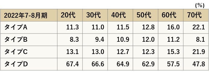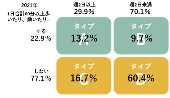 年代別で比較すると、タイプAは70代が22.1%と最も高い結果となり運動習慣・活動量とも高い結果なっている。タイプBは50代が12.0%、タイプCは60代が15.3%、タイプCは20代が67.4%と若い世代で運動習慣・活動量が低い方が多い。2021年との比較では、タイプAでは50代が1.17倍と最も増加しており、30~70代までは増加しており、20代のみ0.90代と減少している。またタイプDでは30~70代ではほぼ変わらないが、20代のみ1.10倍と増加が顕著になっている。