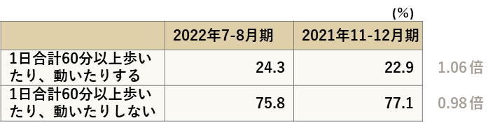 〈図表2:日常の活動量状況(全国、全体、20~79歳、2021-22年比較)単位:%、倍〉