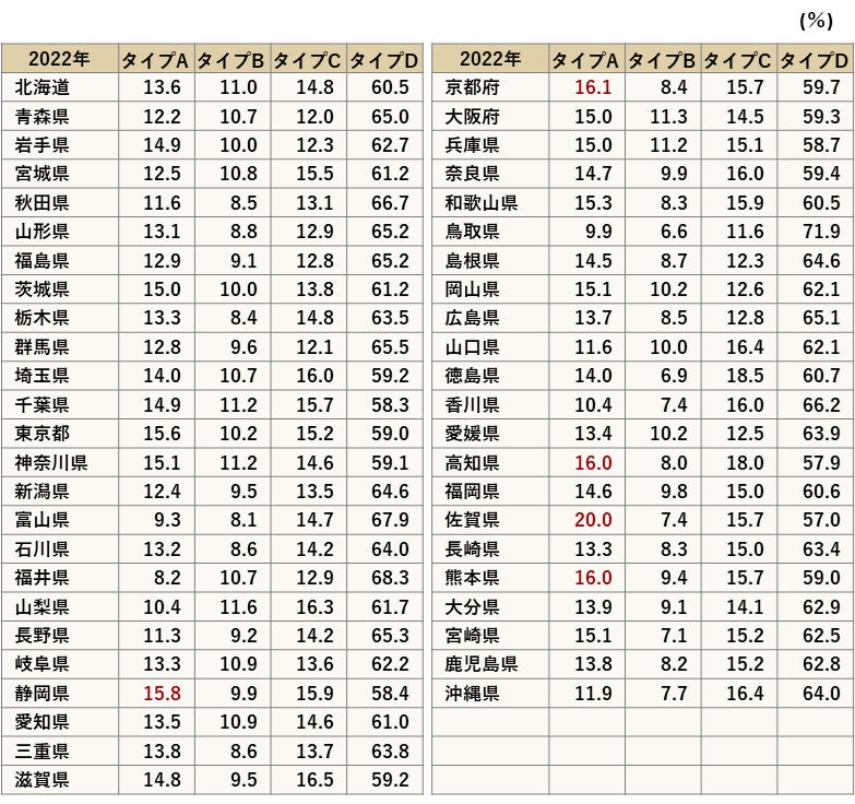 都道府県別で見ると、タイプAが多いのは、佐賀県20.0%、京都府16.1%、高知県16.0%、熊本県16.0%、静岡県15.8%の順となっており、少ないのが、福井県8.2%、富山県9.3%、鳥取県9.9%、香川県10.4%、山梨県10.4%となっている。