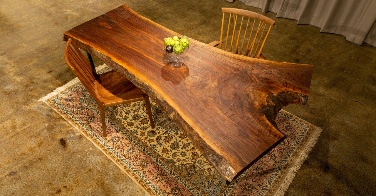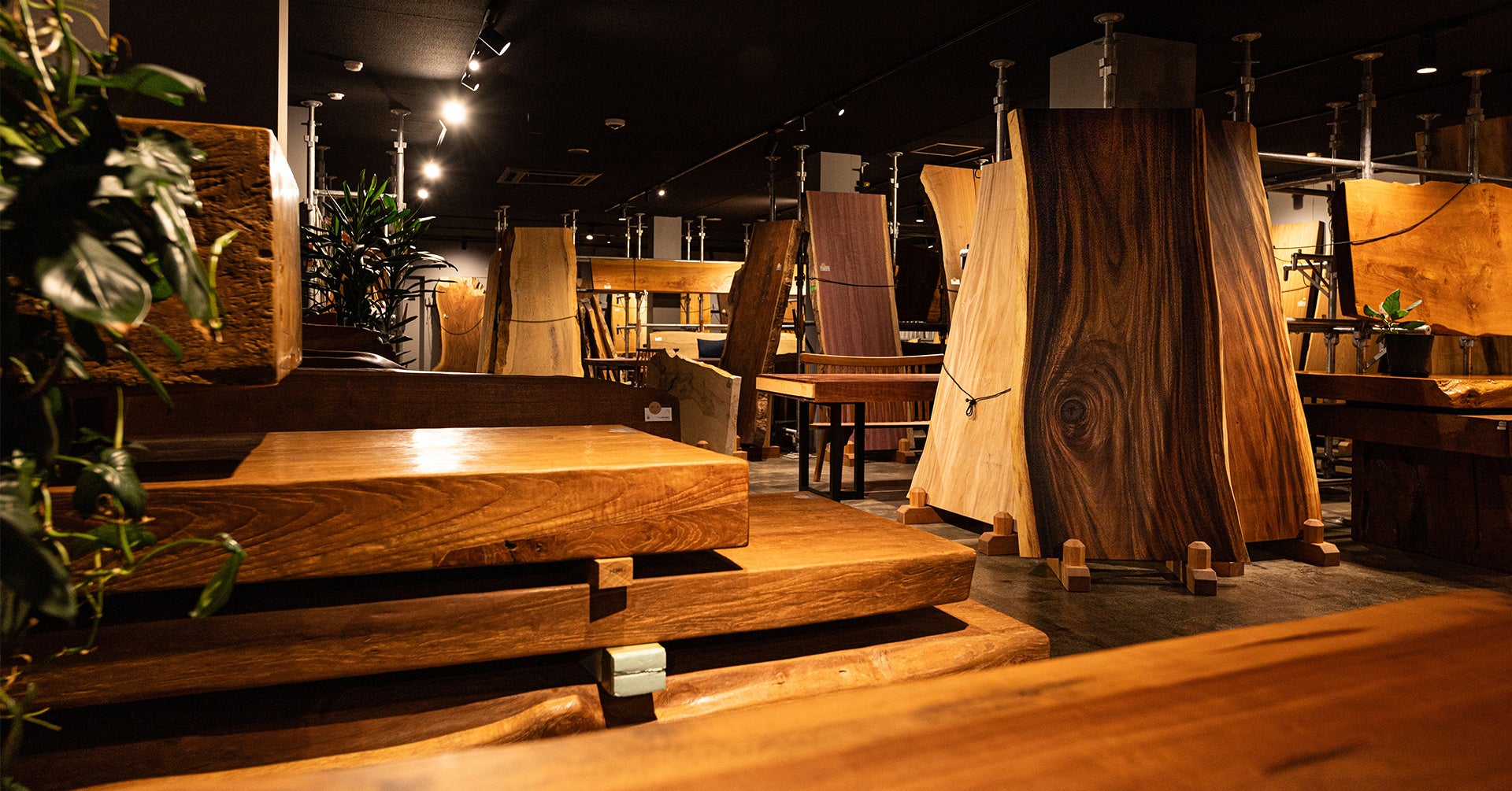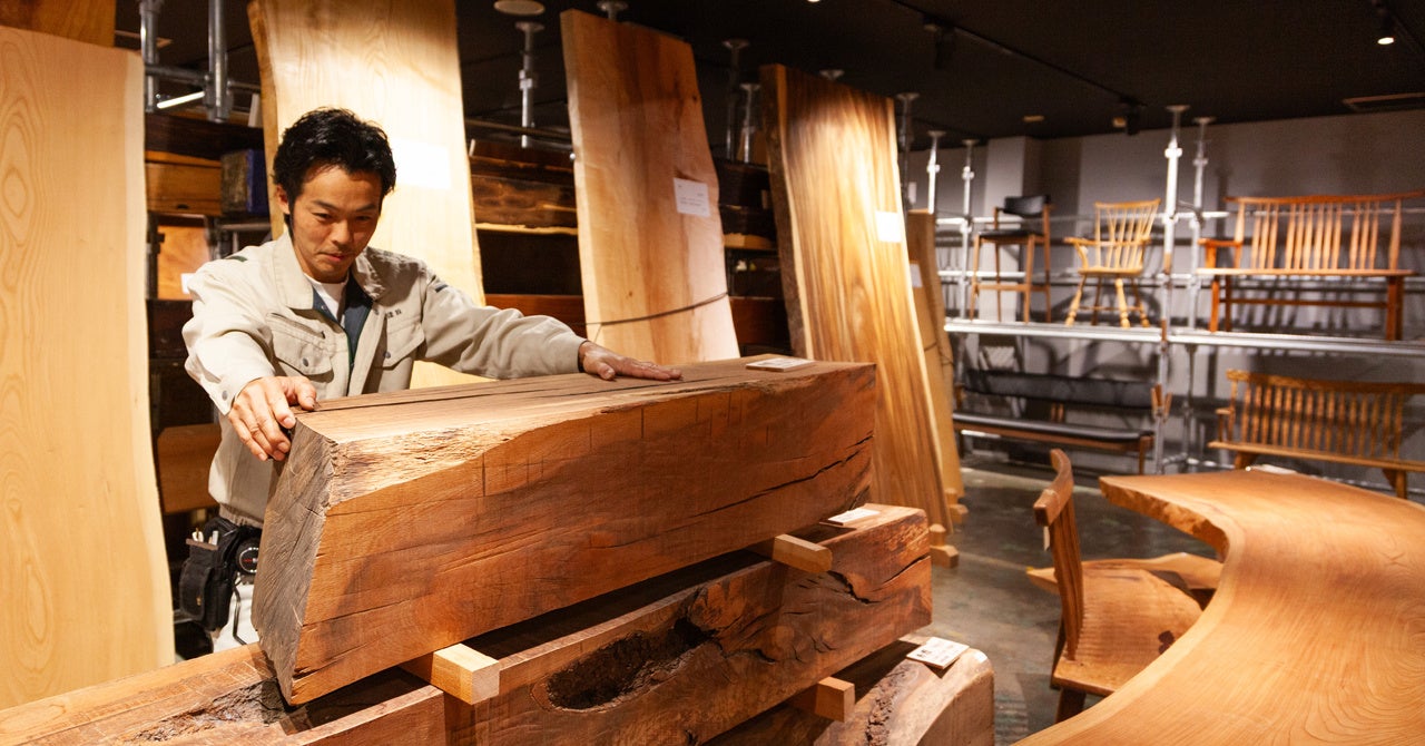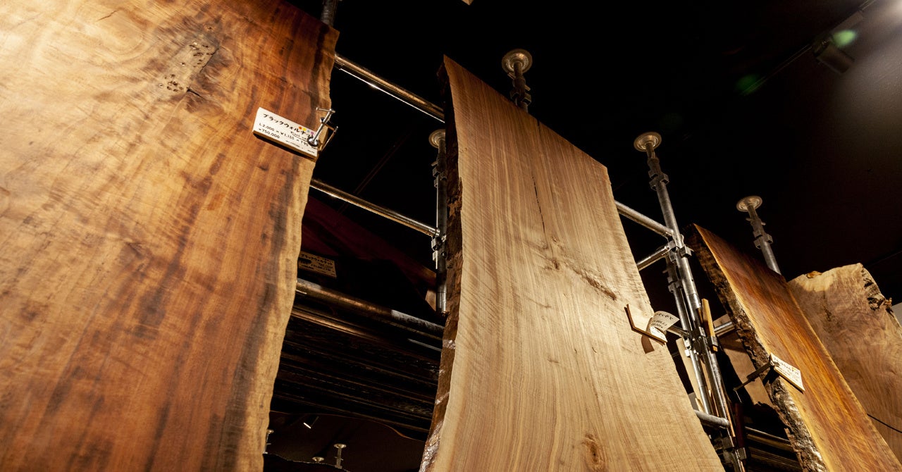 ・希少な無垢板を150枚以上展示。施主は職人とともに理想の「杢」に出会える。