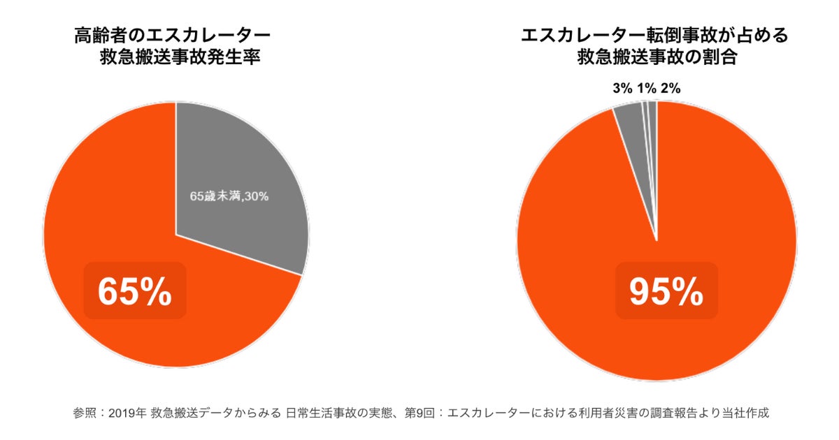 今回2件の死亡事故に共通しているのは「高齢者」の「転倒」が原因であることだ。事故後の各種報道では「挟まれた」ことが大きく取り上げられているが、そもそも挟まれた要因は「転倒」であることが分かっている。日本の高齢者人口は、直近約20年間で10%程度上昇しており、今後もこういった事故は増える可能性が高い。実際に、エスカレーター救急搬送事故の種別としては転倒事故が95%が占め、その内65歳以上の高齢者が65%を占める(2019年東京消防庁「救急搬送データから見る日常生活事故の実態」)。