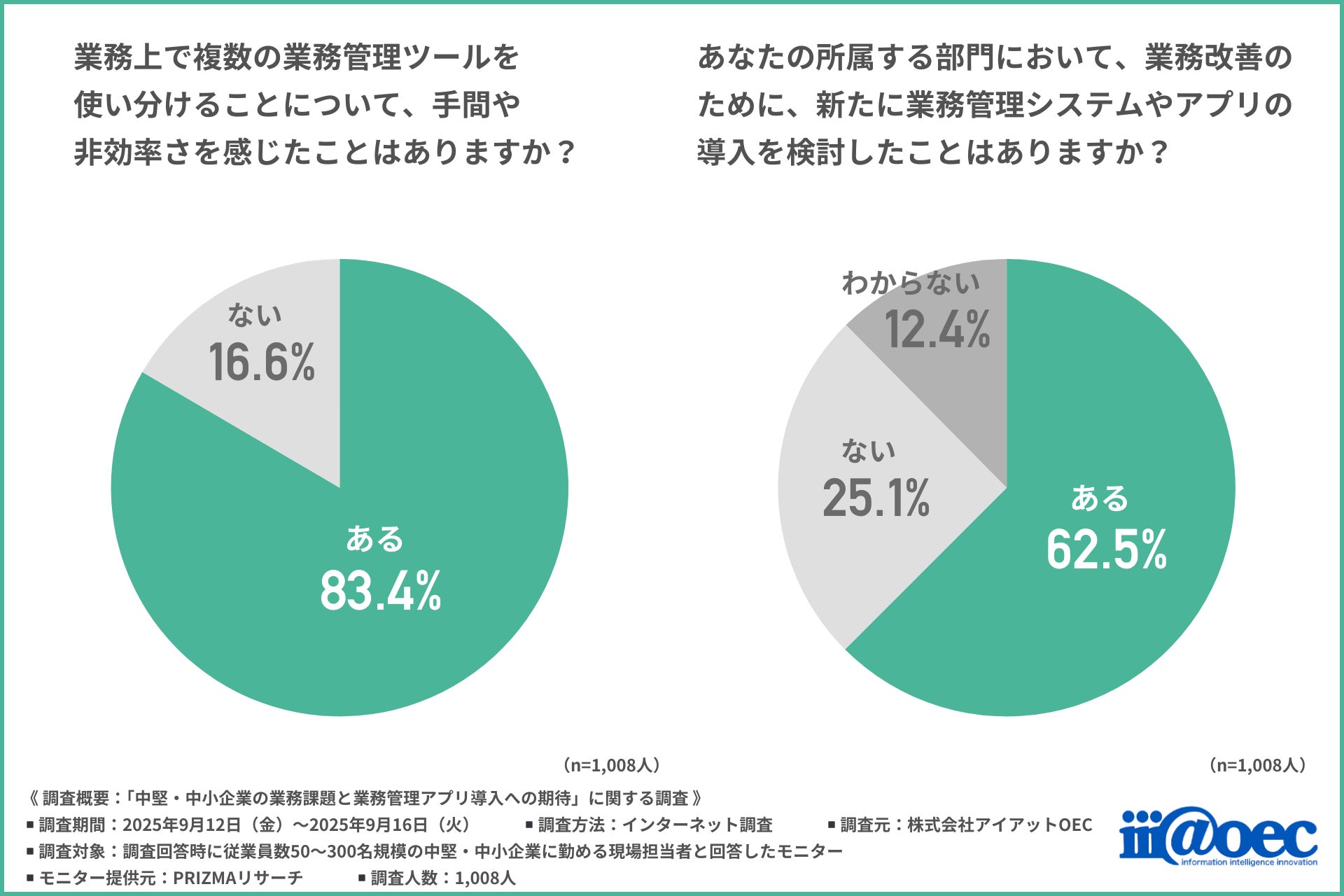 株式会社アイアットOEC(所在地:岡山県岡山市、代表取締役社長:楠田 教夫)は、従業員数50~300名規模の中堅・中小企業に勤める現場担当者を対象に、「中堅・中小企業の業務課題と業務管理アプリ導入への期待」に関する調査を行いました。
