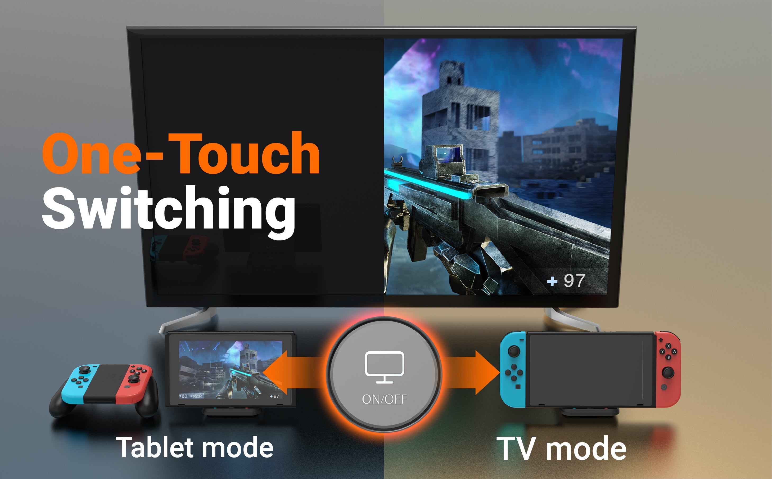 Nintendo Switchで使用する際には、タブレットモードとTVモードの切り替えが可能です。USB-Cスマホで使用する場合、大画面での動画視聴とスマホゲームだけでなく、ライブ配信中に大画面でプレビューしながら、スマホを回転させて高画質のメインカメラで高品質なライブ配信をサポートします。