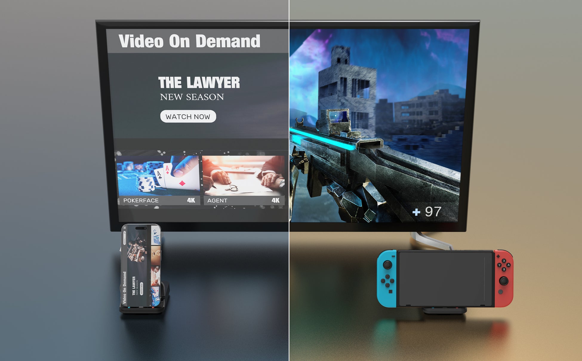 Nintendo Switchの場合は、本機を使って大画面でゲーム画面を投影してプレイできます。更に拡張ポートで、充電しながらUSBコントローラーを増設が可能で、安定した有線インターネット接続により、大画面でゲームを楽しめます。USB-Cスマホの場合は、HDCPにも対応しており、著作権保護された有料コンテンツも映像出力をサポートし、大画面で動画を視聴することができます。スマホゲームも大画面で楽しめます。
