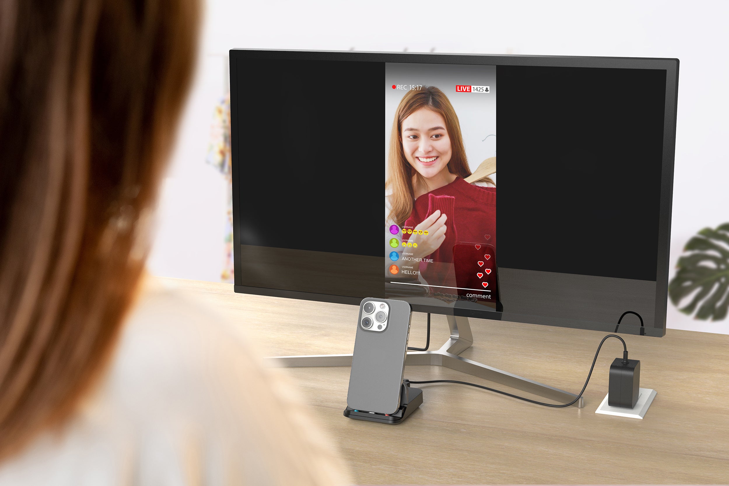 USB-Cスマホを本機スタンドに接続することで、PD充電しながら大画面にミラーリングして動画視聴ができます。また、スマホでライブ配信する際には、スマホの高画質カメラで撮影している映像を大画面で確認を行い、配信することができます。