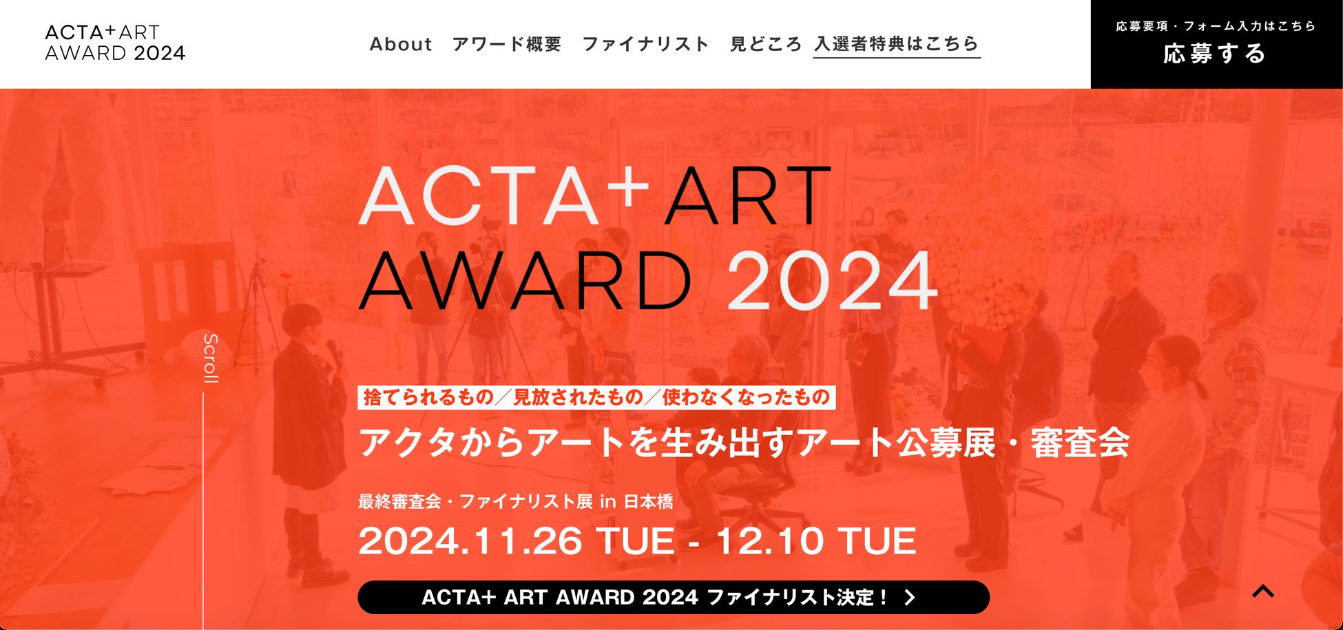ACTA+ ART AWARD 2024は、2024年7月1日〜8月31日まで「本来であれば捨てられるはずだったもの(=廃棄物)」を使った現代アート作品のプランを募集し、全国各地から集まった107件の作品プランの中から11名のファイナリストを選出しました。