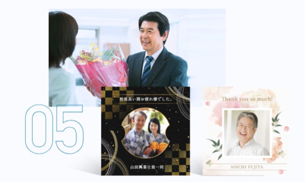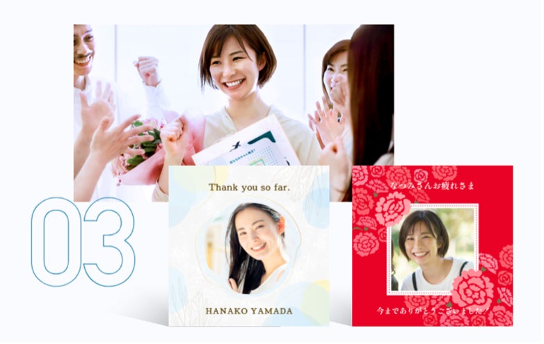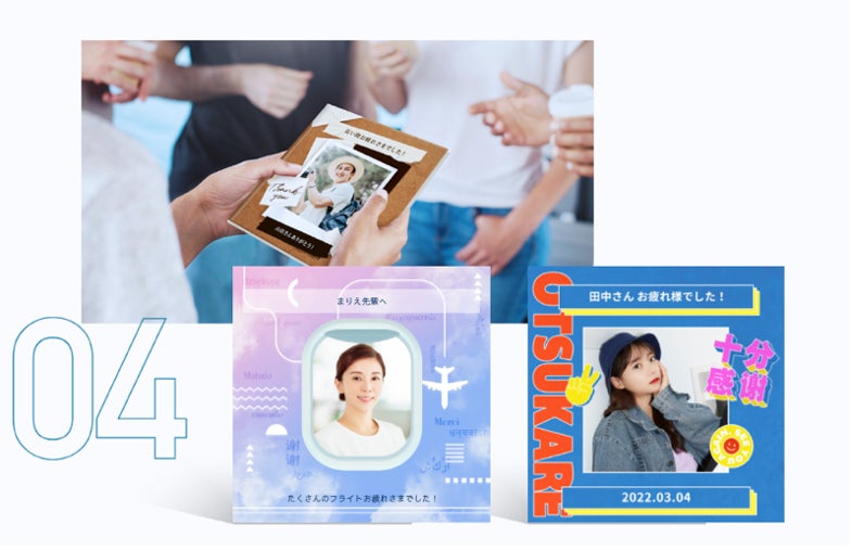 送別シーズンのみならず、離れて暮らすご家族への贈り物や、好きなアイドルやタレントへの「推し活」での贈り物としてなどさまざまなご活用が可能です。デザインも性別やシーン・お好み別で豊富に取り揃えており、贈られる側だけでなく贈る側も楽しんでいただけるサービスとなっています。