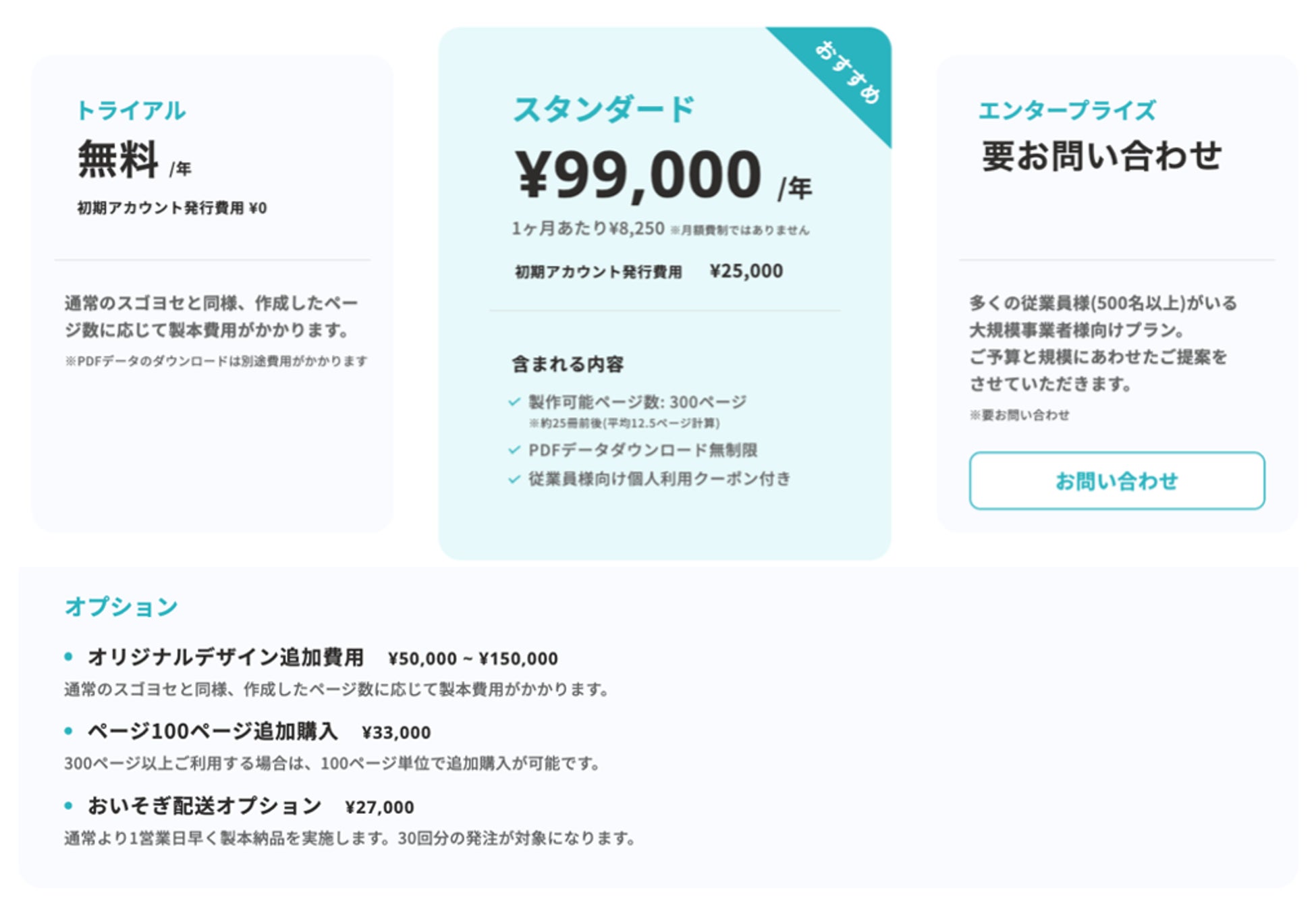 本サービスは法人様を対象とし、1年単位で年間契約にてご利用いただけるサービスとなっております。法人プランは製本版の作成ページ数によって料金形態の異なる3つの料金プランよりお選びいただけます。スタンダード以上のプランでは、PDF版の作成は回数・冊数等の上限なく使い放題でご利用いただけて、製本版も通常の製本発注に比べて約20~30%もお安くご利用いただけます。また、導入いただく企業様に合わせたオリジナルのデザインテンプレートの制作にも対応しており、より特別な体験としてオリジナルデザインのスゴヨセをお贈りいただくことでエンゲージメントの向上が期待できます。