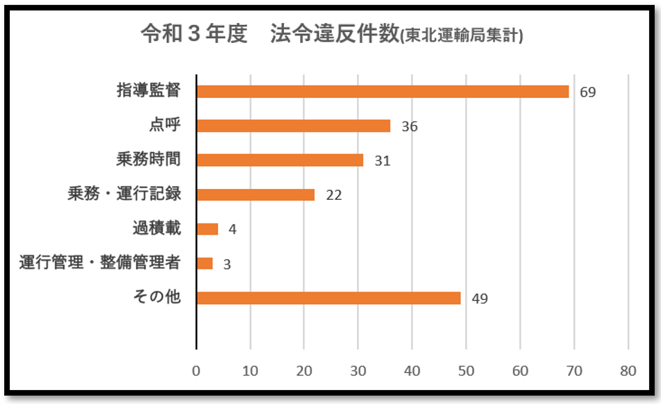 令和3年度、東北運輸局の統計でも「指導監督」が違反項目としてダントツのワースト1でした。(図2)