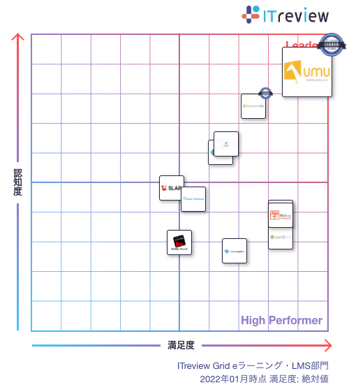 ユームテクノロジージャパン株式会社(本社:東京都渋谷区、代表取締役:松田しゅう平、以下、ユームテクノロジー)が提供するオンライン学習プラットフォーム「UMU(ユーム)」は、アイティクラウド株式会社(本社:東京都港区、代表取締役社長 兼 CEO:黒野 源太)が主催のアワード「ITreview Grid Award 2022 WINTER」にて、「eラーニング・LMS部門」「セールスイネーブルメント部門」「マニュアル作成・編集部門」それぞれにおいて満足度・認知度ともに優れた製品であると評価され、「Leader」を同時受賞いたしましたので、お知らせいたします。