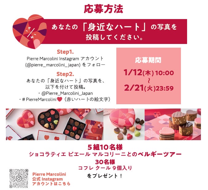 注目は世界初登場の新作チョコレート「レ クール ヌーヴォ シリーズ」をメインに詰め合わせた「ヌーヴェル セレクション」。今年の日本のバレンタイン向けに開発された世界最速発売の新商品となっております。そして「レ クール ヌーヴォ シリーズ」をはじめ、ピエール マルコリーニのアイコン的存在であるハートモチーフのチョコレート「クール シリーズ」を存分にお楽しみいただける「コフレ クール」。今年は様々な気持ちをハートに見立て重ねている模様を表現した可愛いハート型のパッケージでお届けします。また、ショコラとケーク ショコラなどの焼き菓子を詰め込んだ「ショコラ & パティスリー セレクション」は大切な人とのシェアやギフトにおすすめです。日本が大好きなピエール マルコリーニ本人の想いを体現したバレンタイン コレクションを、是非大切な人への気持ちを伝える機会にお買い求めください。- ピエール本人と巡るベルギーツアーが当たる!バレンタインSNS投稿キャンペーン開催