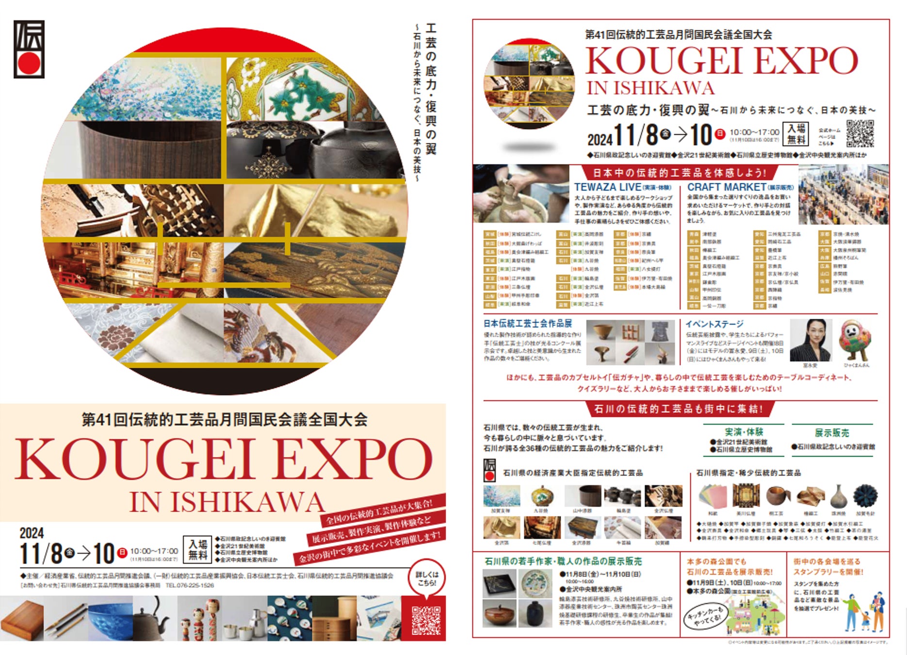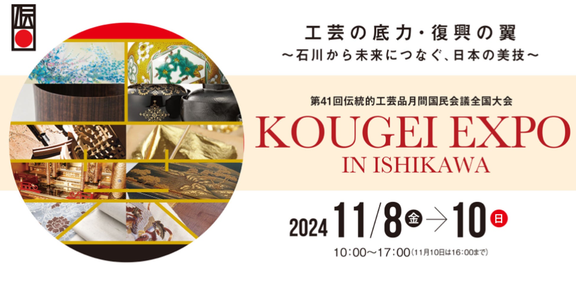 一般財団法人 伝統的工芸品産業振興協会は、日本全国の伝統的工芸品が一堂に会する「KOUGEI EXPO IN ISHIKAWA(第41回伝統的工芸品月間国民会議全国大会)」を、2024年11月8日(金)~10日(日)「石川県政記念しいのき迎賓館」「金沢21世紀美術館」等をメイン会場として開催します。