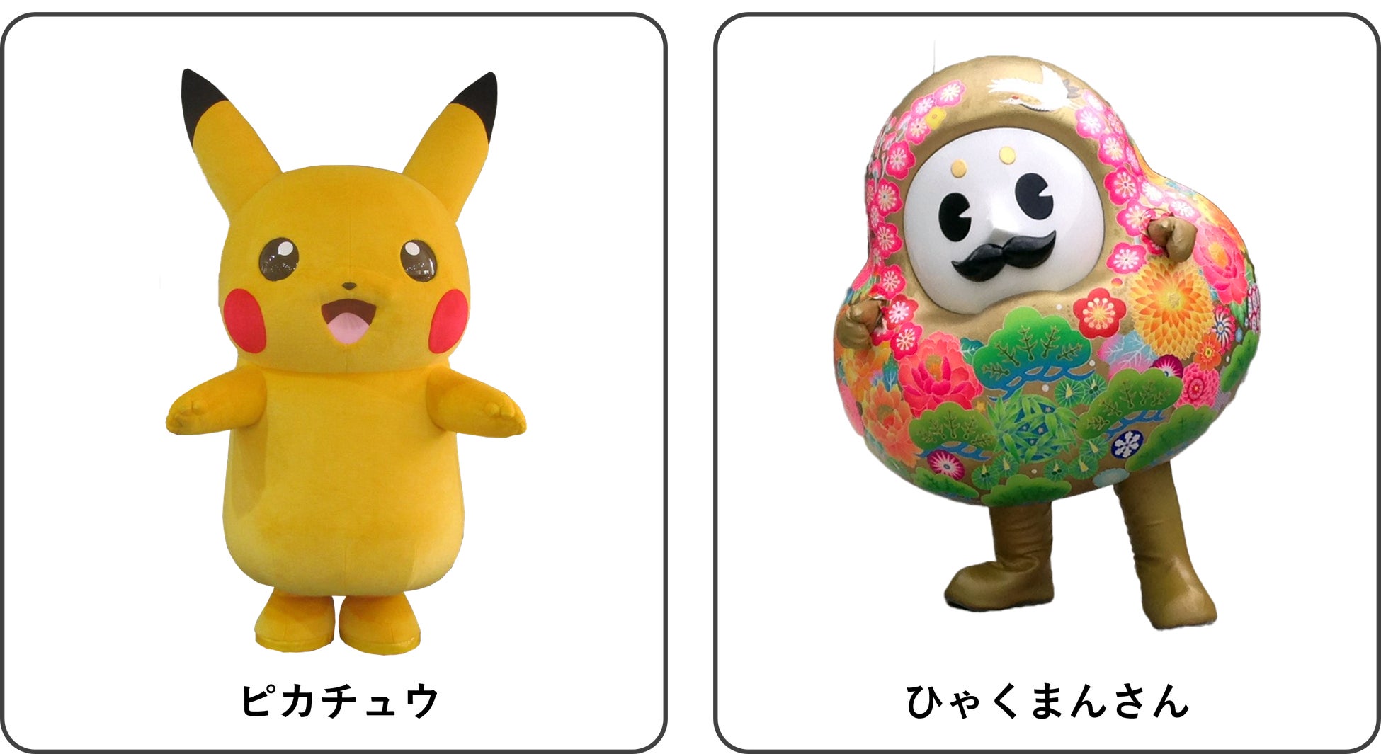 石川県観光PRマスコットキャラクターひゃくまんさん、大人気ポケモンのピカチュウがステージに登場!ひゃくまんさんは、輪島塗などの漆工芸や金沢箔、加賀友禅、九谷五彩など、石川の伝統工芸をイメージさせるデザインが取りいれられています。かわいいキャラクターたちと写真を撮りましょう!