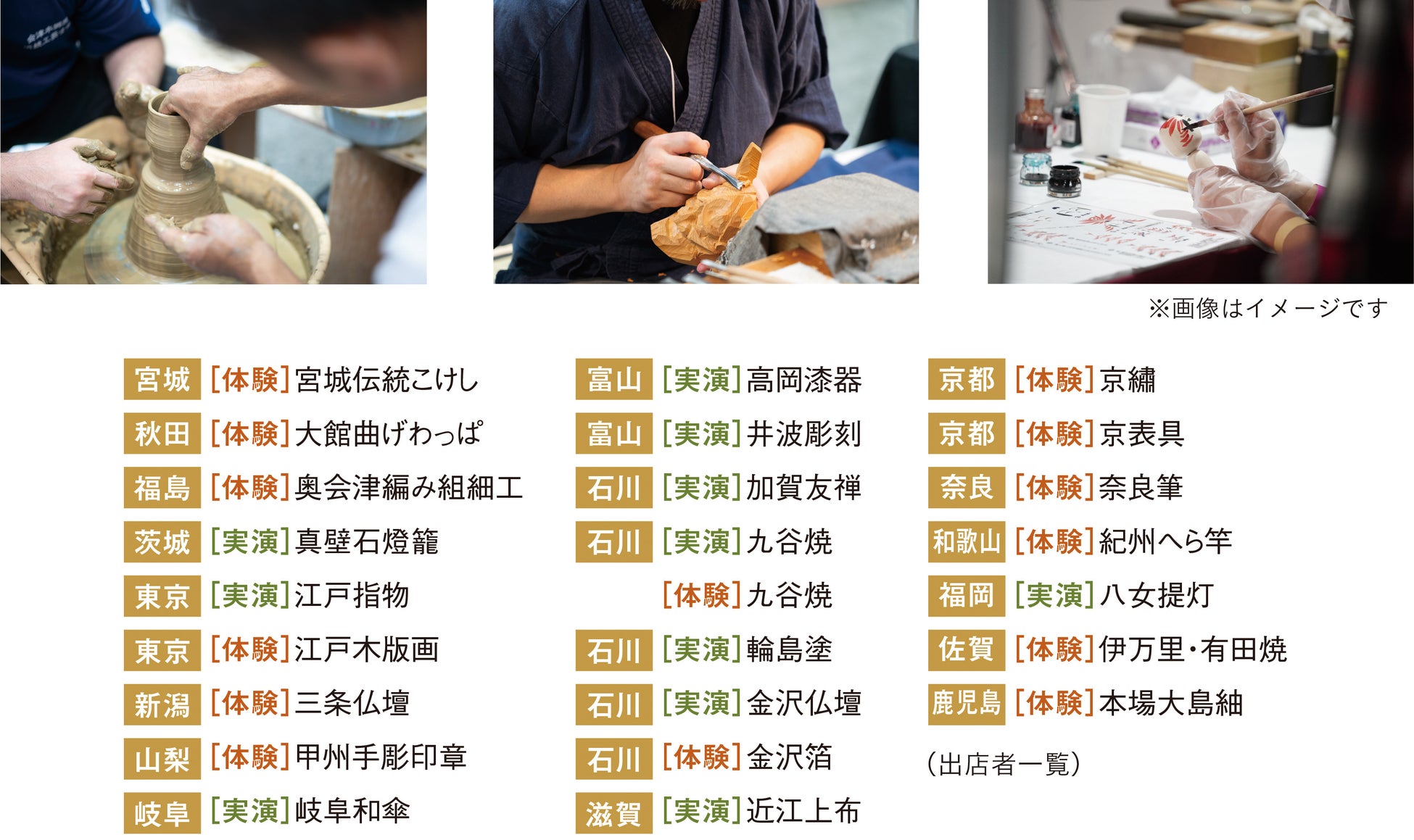 大人から子どもまで楽しめる体験型ワークショップ、職人たちの磨き抜かれた技を間近に見ることのできる製作実演や漆の原材料のご紹介など、さまざまな角度から伝統的工芸品の魅力をご紹介します。作り⼿の想いや、⼿仕事の素晴らしさを、実際に作り手と交流しながら体感してみてください。