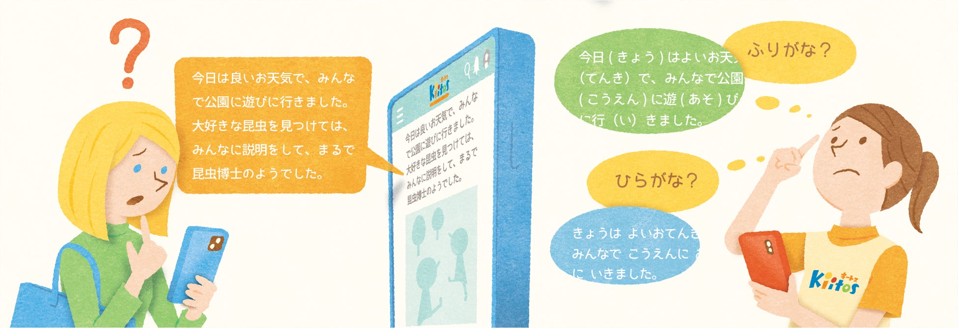 キートスには現在様々な国籍の保護者・園児が通っており、使用されている言語も様々です。中には日本語の会話や読み書きが難しい方もいらっしゃいます。これまでは英語を話す事ができる保育士が対応したり、文面でお知らせする場合はひらがなで記載をしておりました。