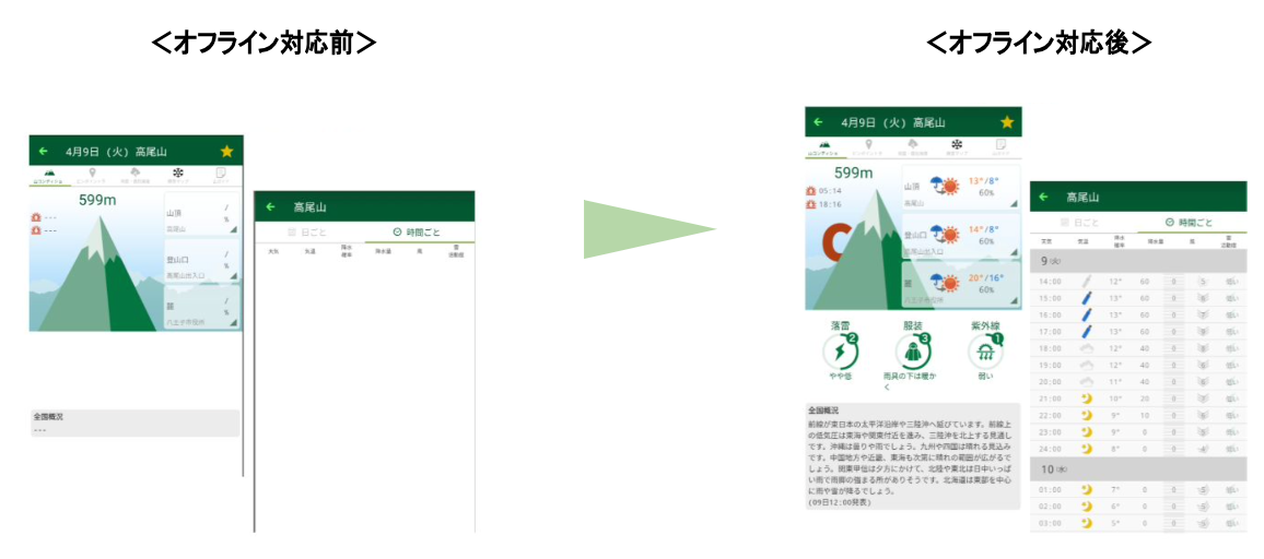 これから本格的に始まる夏山登山シーズンに向けて、電波がつながらないオフライン状態でも山の天気情報を確認できる新機能を追加いたしました。具体的には、電波のつながる環境でスマートフォンが取得した1日ごとの天気や時間ごとの天気を確認できます。