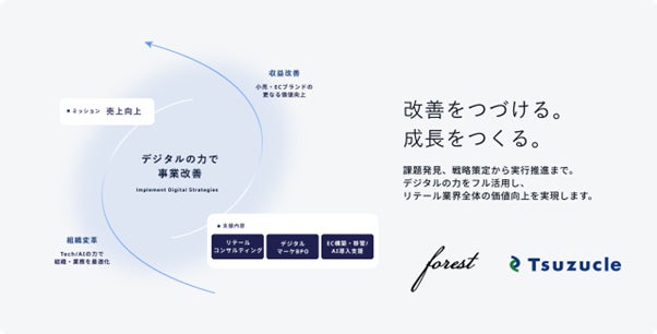 多様なブランド運営を通じてSPAおよびEコマース領域で知見を培ってきたforestと、デジタルマーケティングおよびEC開発に強みを持つTsuzucleのシナジーを活かし、Eコマースとテクノロジーを融合させ、リテール業界全体の価値向上に貢献してまいります。
