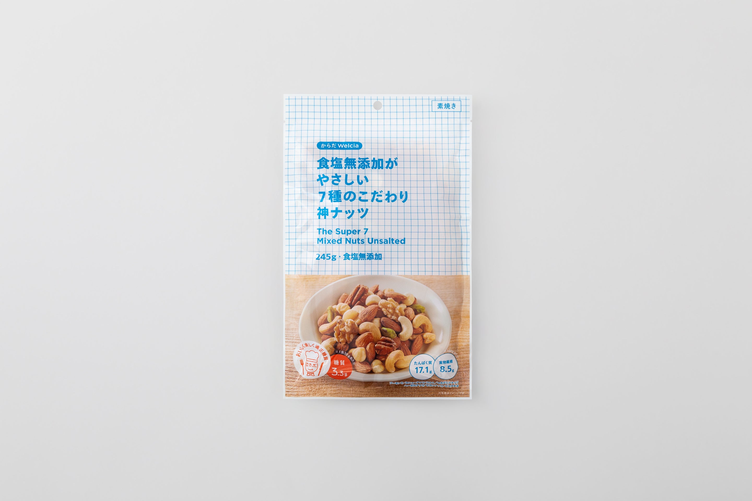 “ギルティー・フリー”と“ヘルシー&テイスティ”というからだWelciaの食品コンセプトのもと、食塩・油不使用の素焼きミックスナッツを開発しました。