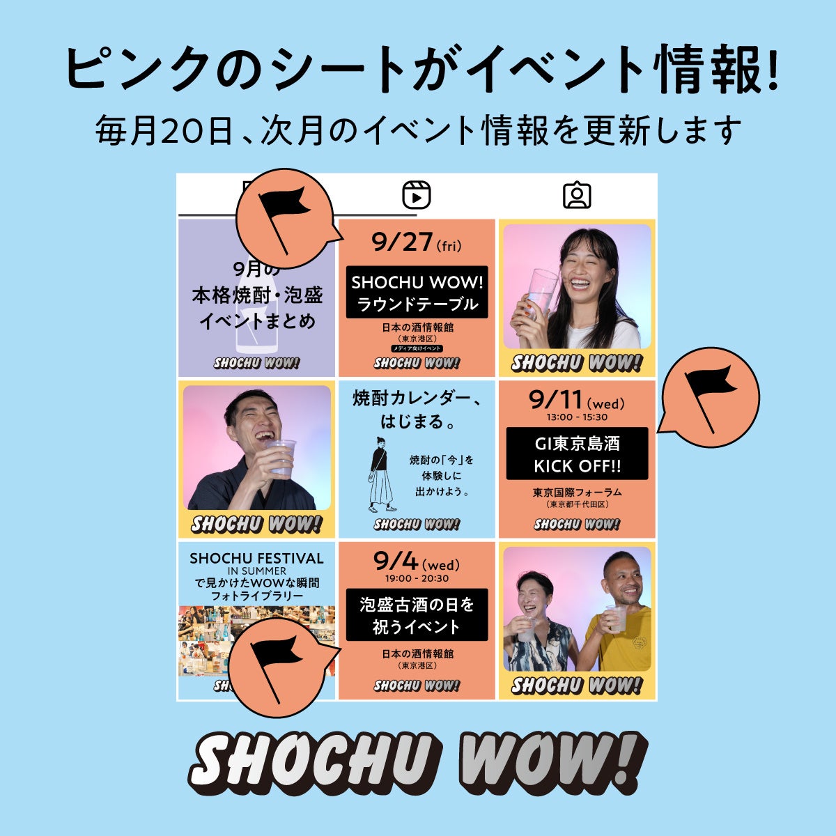 全国各地で開催される様々な本格焼酎・泡盛にまつわる催事・イベント情報や、本格焼酎・泡盛にまつわるコラムを毎月定時にまとめてお知らせいたします。また、本格焼酎・泡盛に出会いその魅力に驚いた瞬間を撮影した写真を「SHOCHU WOW! フォトライブラリー」として紹介してまいります。本施策により、日本が誇る國酒である本格焼酎・泡盛に触れる機会を増やし、国内外の多くの方に“日常的に楽しむお酒”として本格焼酎・泡盛を知っていただくことを目指します。