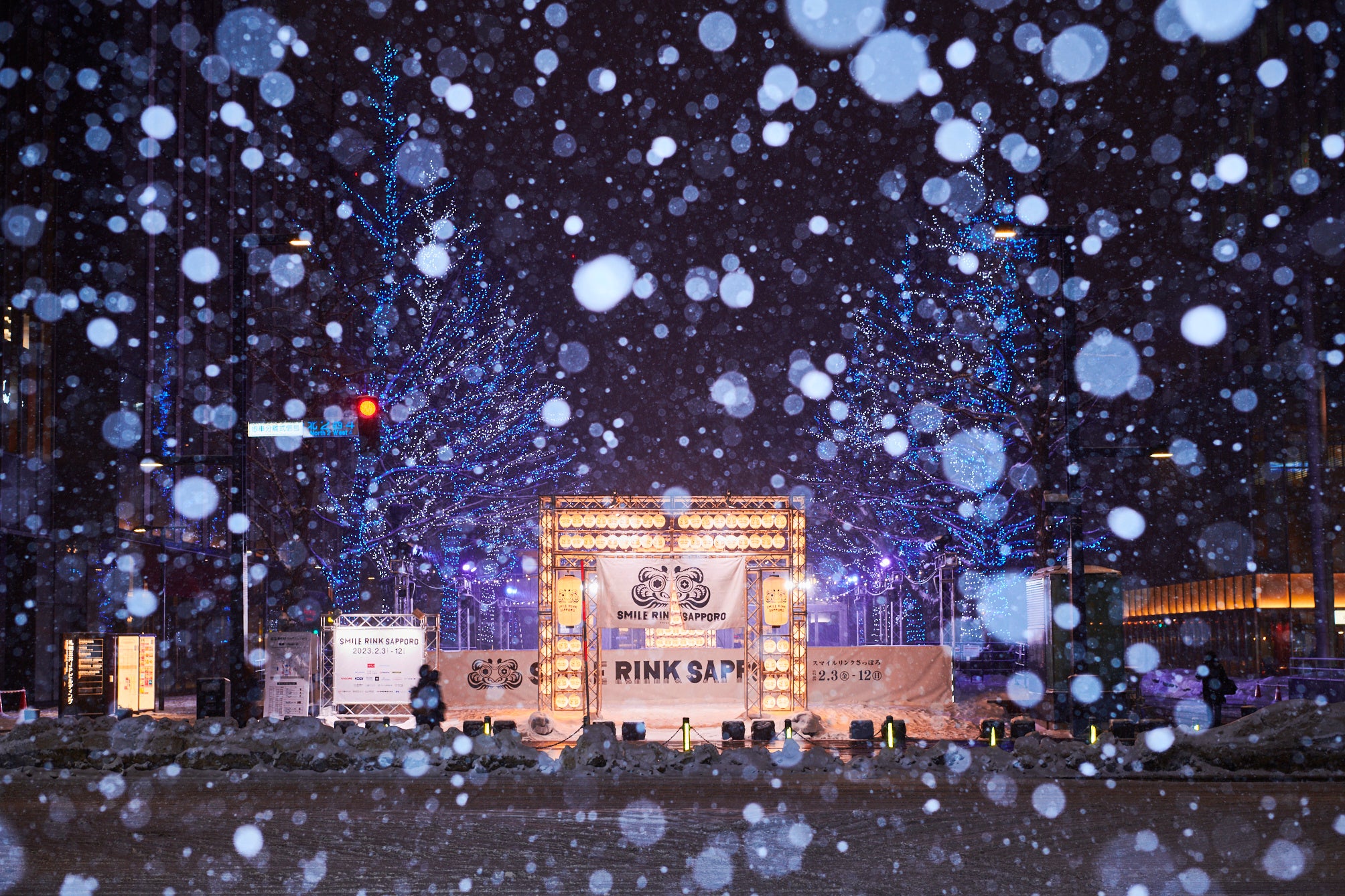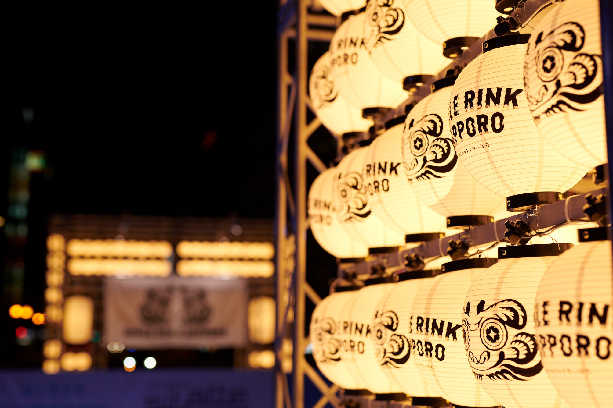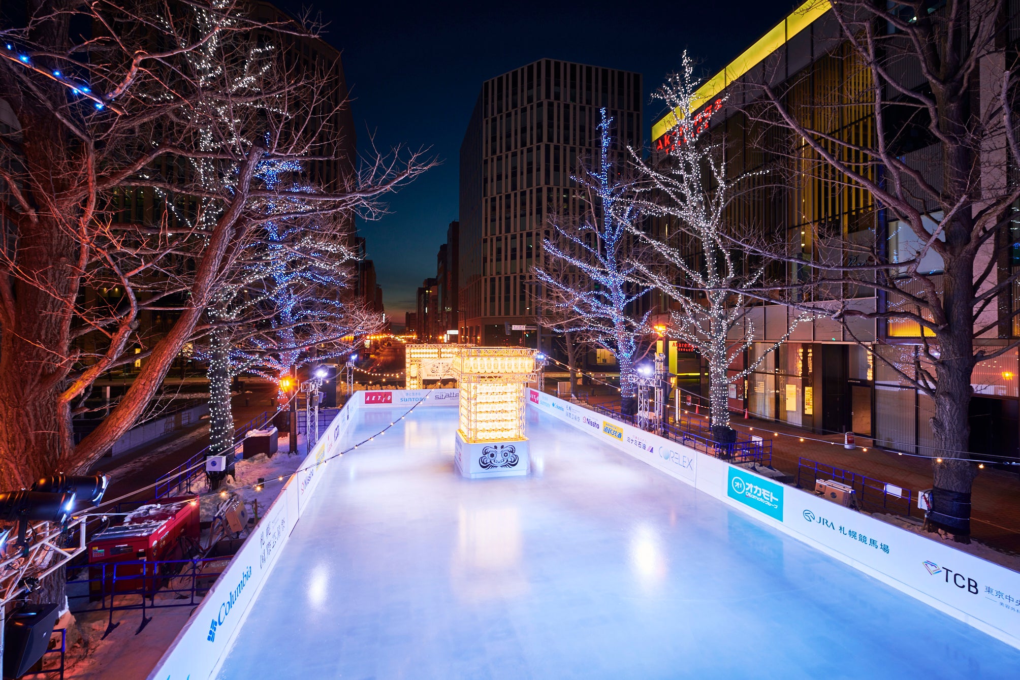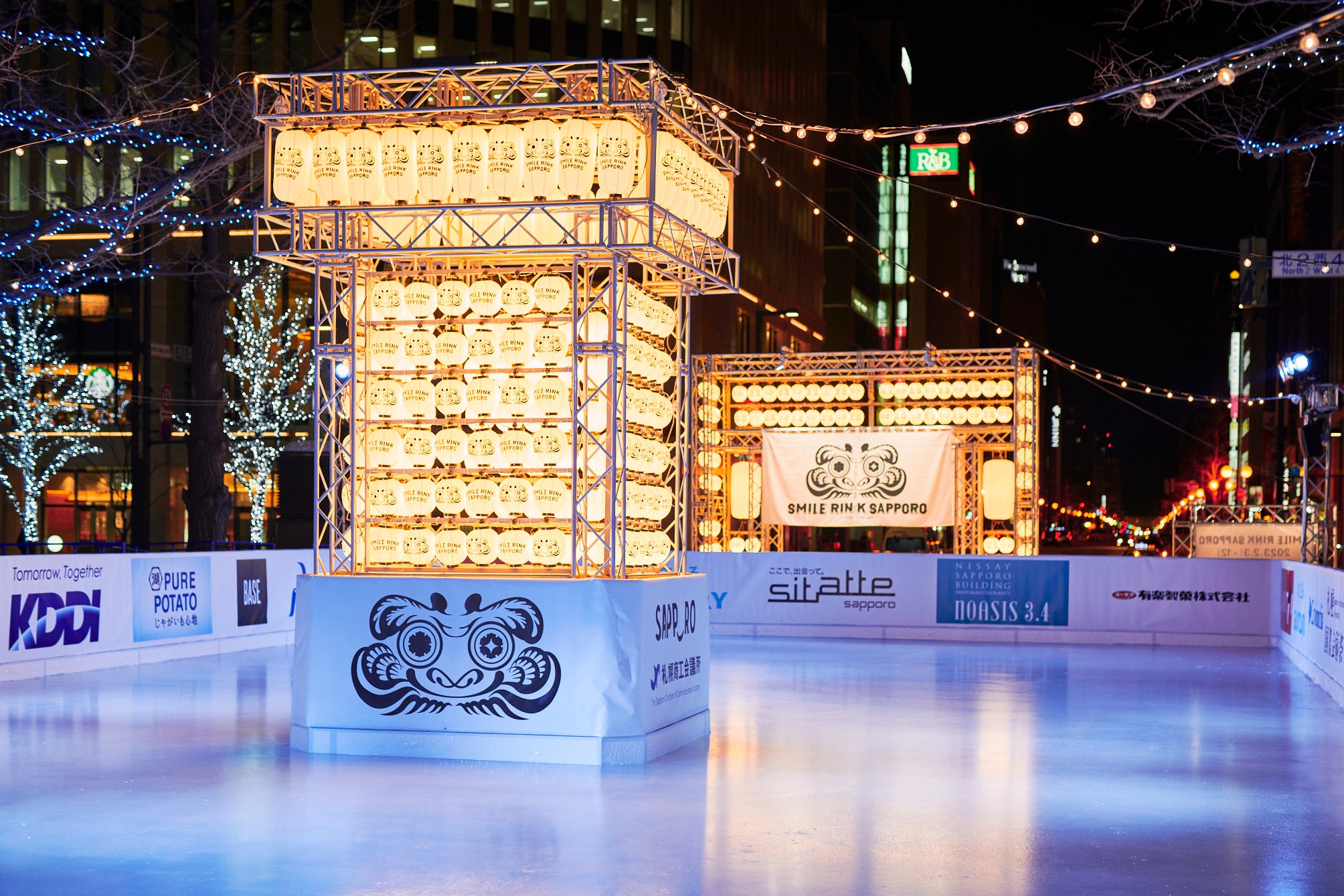会場内には、約28m×12.5mの氷のスケートリンクが置かれ、スケートリンク中央には、「日本の祭」をイメージした高さ約4.8m櫓のモニュメント、札幌駅前通側には暖簾がなびく“だるま門”も登場しました。期間中毎日16時30分から21時までライトアップをいたします。