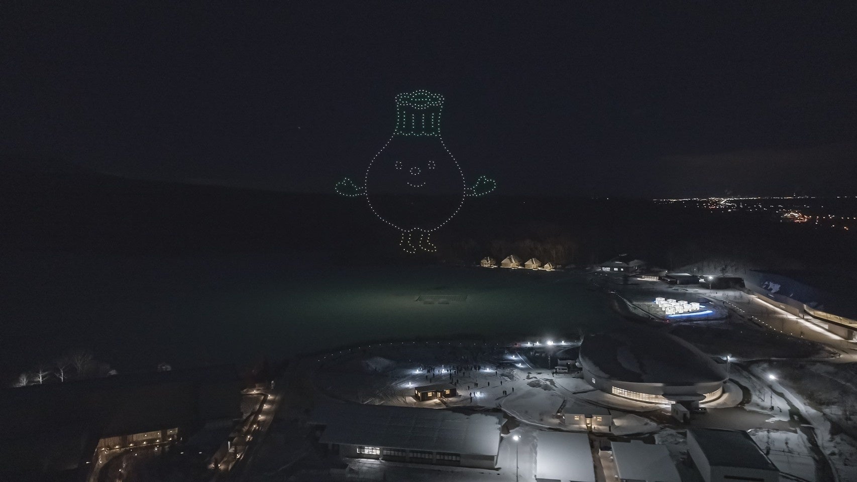 北海道白老町のウポポイ(民族共生象徴空間)にてドローンショーは初めての開催です。連日「アイヌ語のあいさつ」や「ウポポイPRキャラクター トゥレッポん」「シマフクロウ」などのウポポイやアイヌ文化に因んだオリジナルアニメーションがウポポイの夜空を暖かく彩りました。