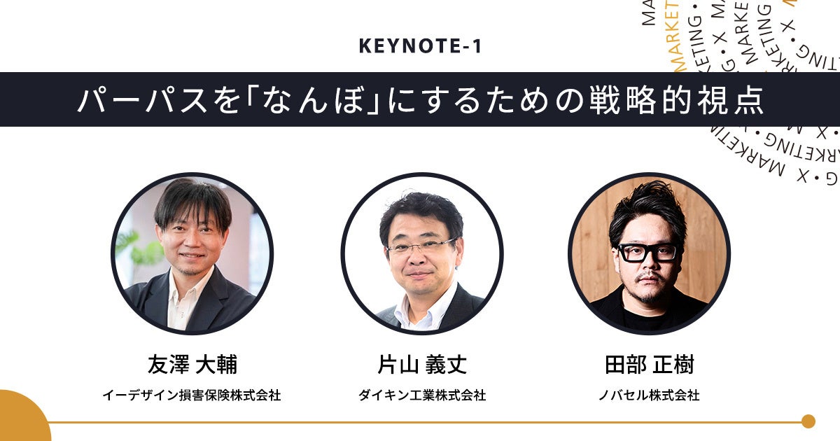 初日冒頭に行われる、Keynote-1のセッションでは、”パーパスを「なんぼ」にするための戦略的視点”と題し、ダイキン工業 総務部 広告宣伝グループ長の片山義丈氏、ノバセル 代表取締役社長の田部正樹氏、イーデザイン損保 CMOの友澤大輔氏の3名が、パーパスの設定を具体的にどうマーケティング戦略の中で価値に転換するかについて議論します。
