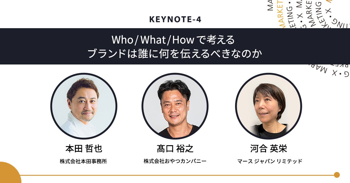また、2日間の最後を飾るKeynote-4のセッションでは、"Who/What/How で考える ブランドは誰に何を伝えるべきなのか"をテーマに、おやつカンパニー マーケティング本部 取締役 専務執行役員 マーケティング本部長の髙口裕之氏、マース ジャパン ペットケアマーケティングディレクターの河合英栄氏、本田事務所 PRストラテジストの本田哲也氏の3名により、顧客を徹底的に見つめ、自社や商品、サービスの持つ価値を蓄積した上でブランドがコミュニケーションで何を重視すべきかについて議論します。