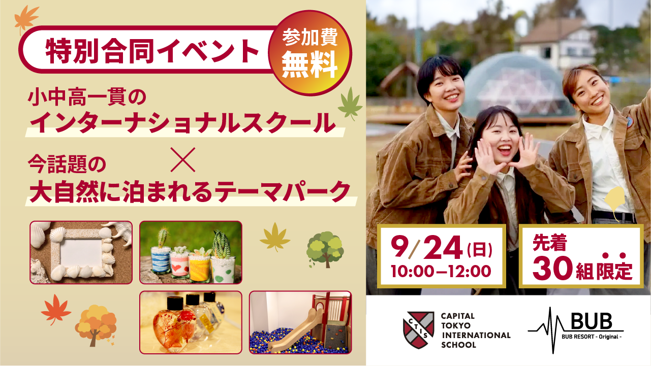 今回2024年度入試出願開始と、放課後プログラム(CTISエクスペリエンス)の外部生公開に合わせた特別イベントとして、小学部が遠足でも利用する今話題の泊まれるテーマパーク「BUB RESORT」と合同で無料の特別イベントを開催いたします。