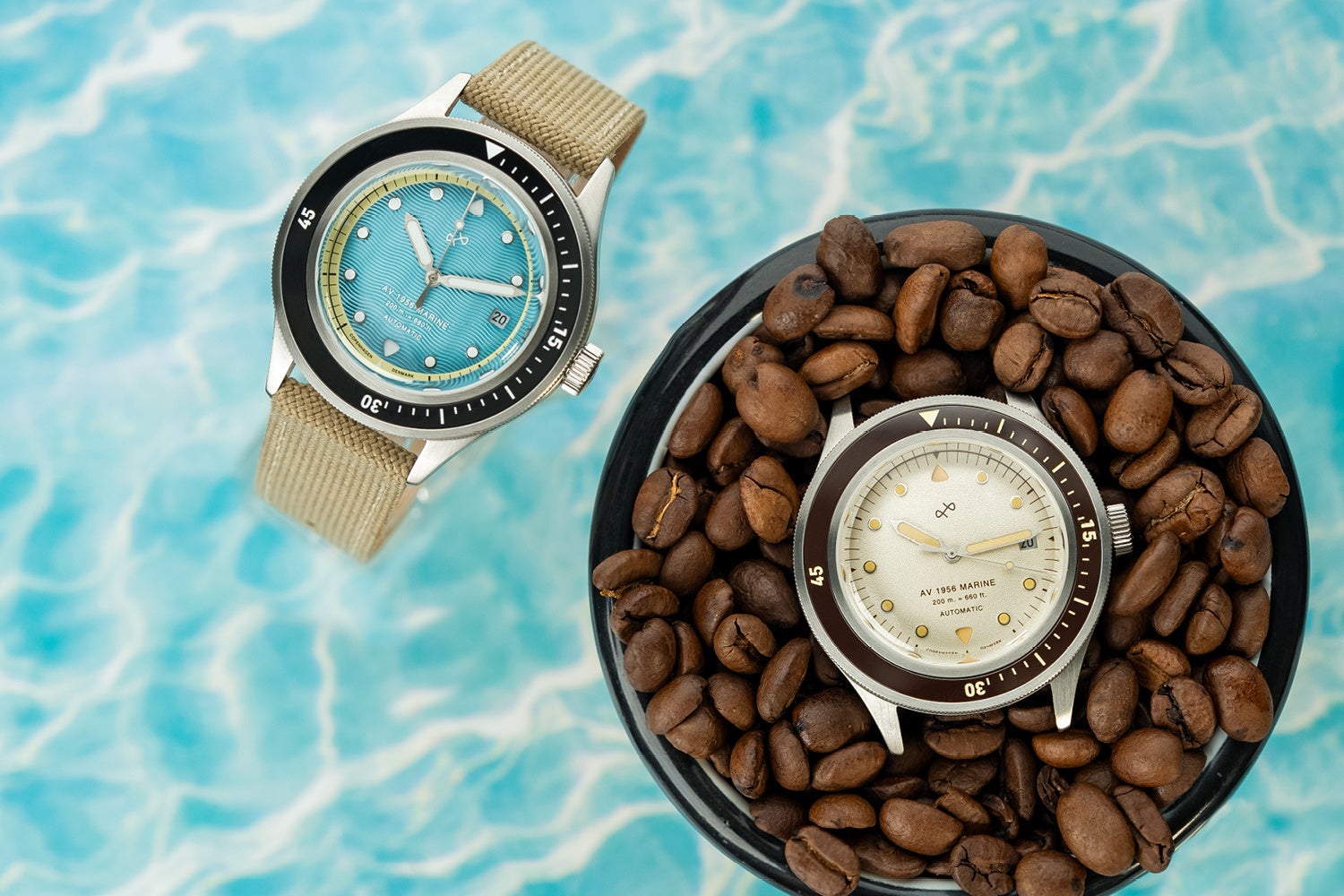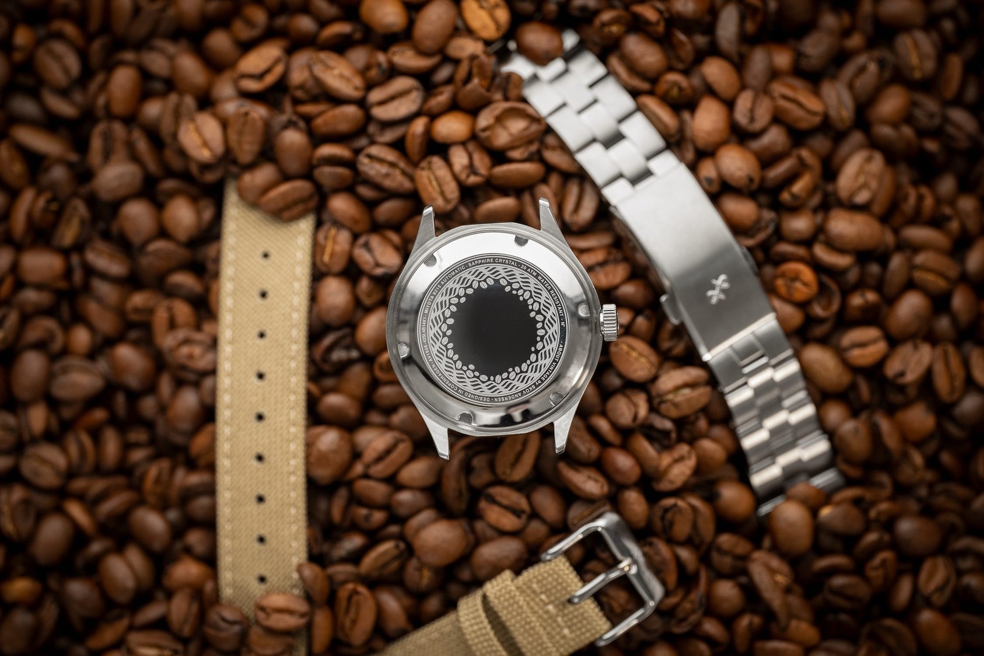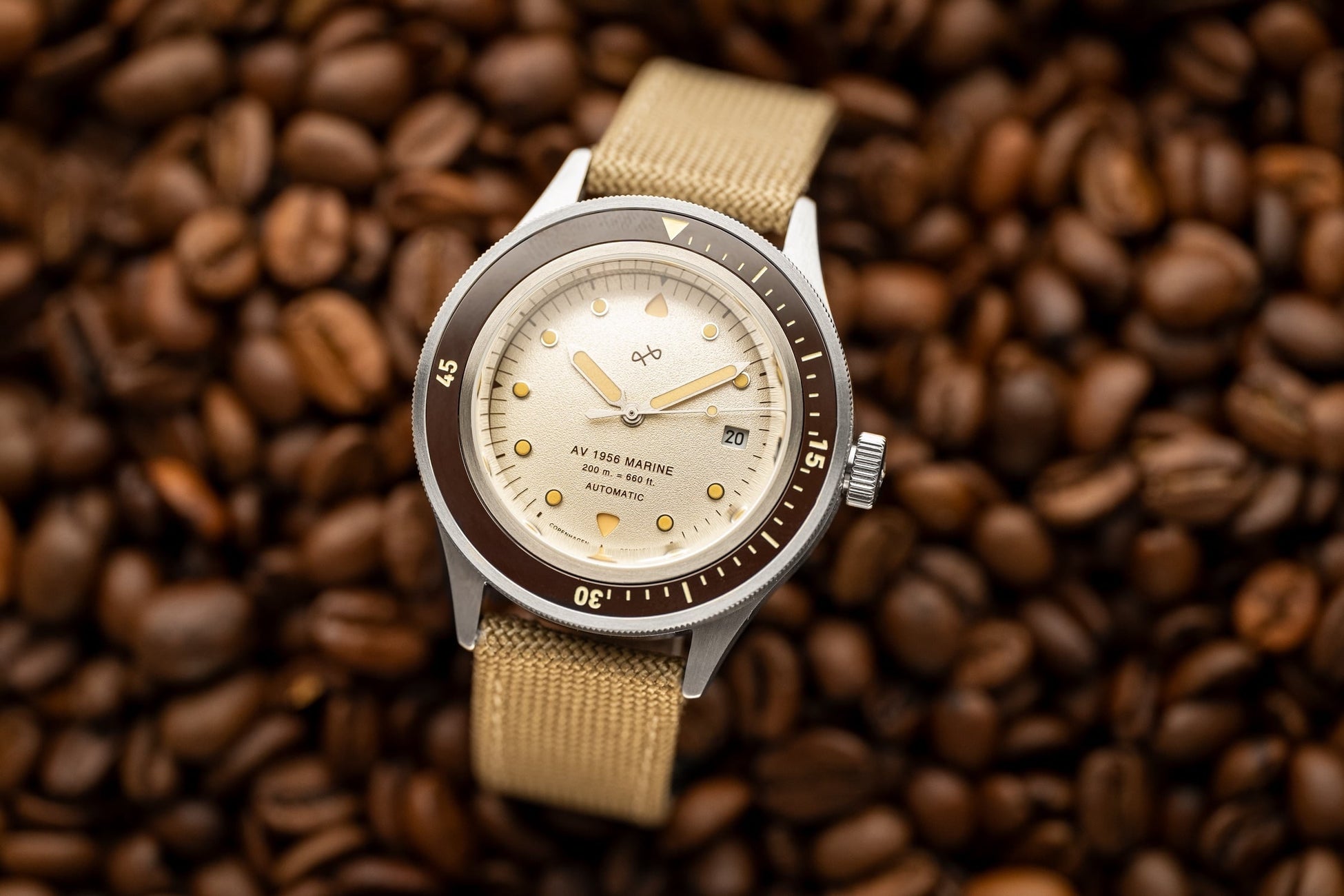 Coffee & Creamは、ダークなカリビアンコーヒーを想起させる、少し珍しいダークブラウンのセラミックベゼルと、テクスチャード加工されたクリーム色の文字盤です。白と黒のベゼルではなく、落ち着いたヴィンテージ感と丸みのあるデザインが特徴です。