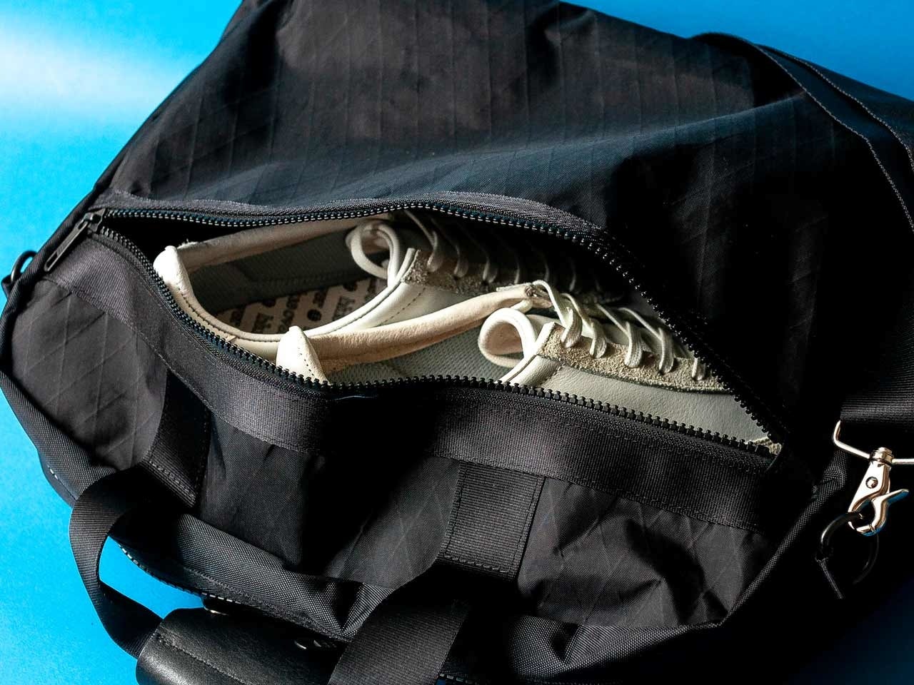 また、ビジネスバッグはメインコンパートメント以外のポケットは、基本的には薄型スペースのポケットがほとんどで、体積あるものは収納できない仕様になっている。そのため、メインコンパートメントにスポーツに使う衣類等とデバイスが、同じスペースに収納されてしまうことになるが、仕事道具とそうした道具とは棲み分けたいとデザイナーは考えた。