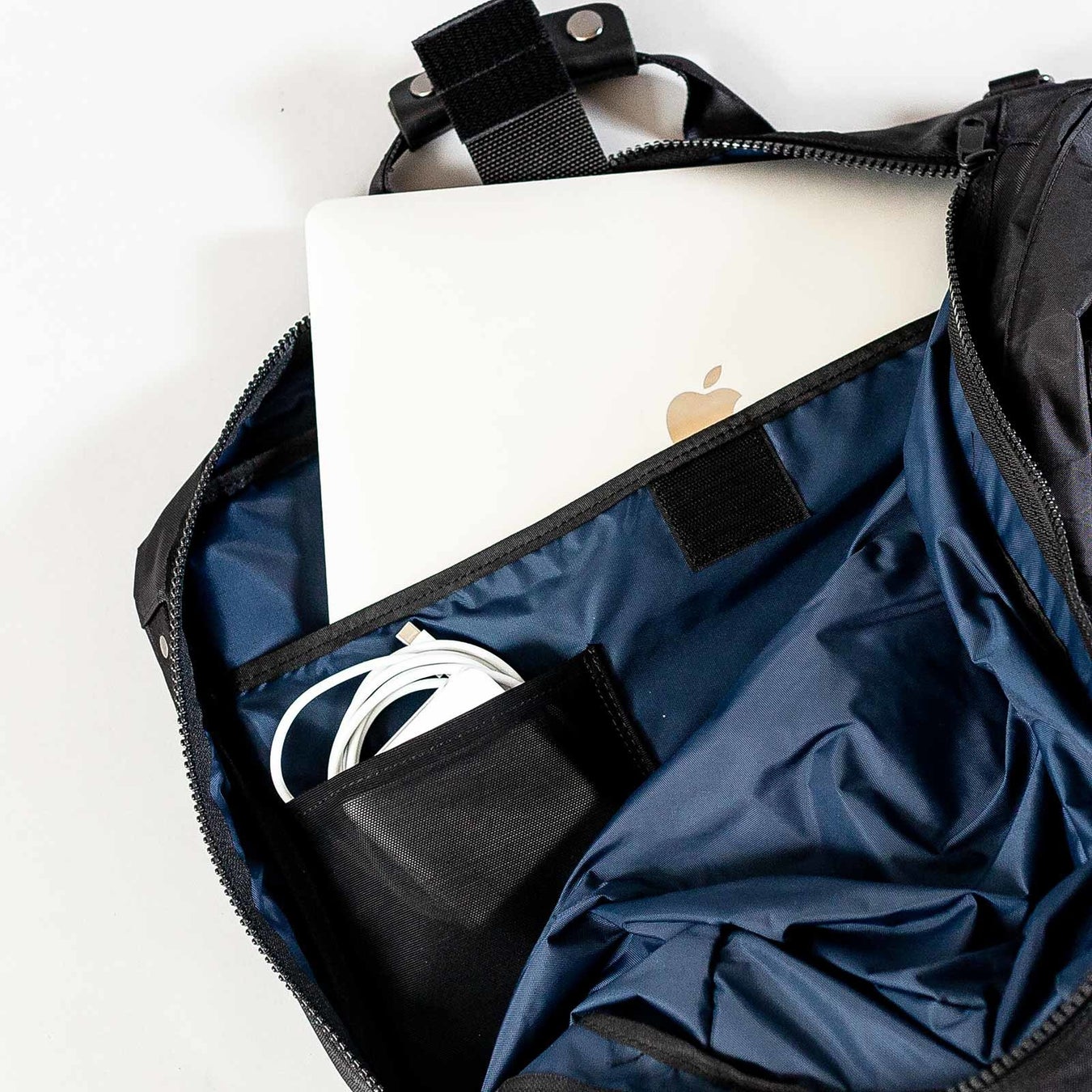 内装はシンプルなオープンポケット2室。前胴には財布やスマホを収納できるサイズのファスナーポケット2室、後胴には靴が入る大きなサブポケットが一室配置。底は摩擦強度のあるバリスティクナイロン1680Dを採用。