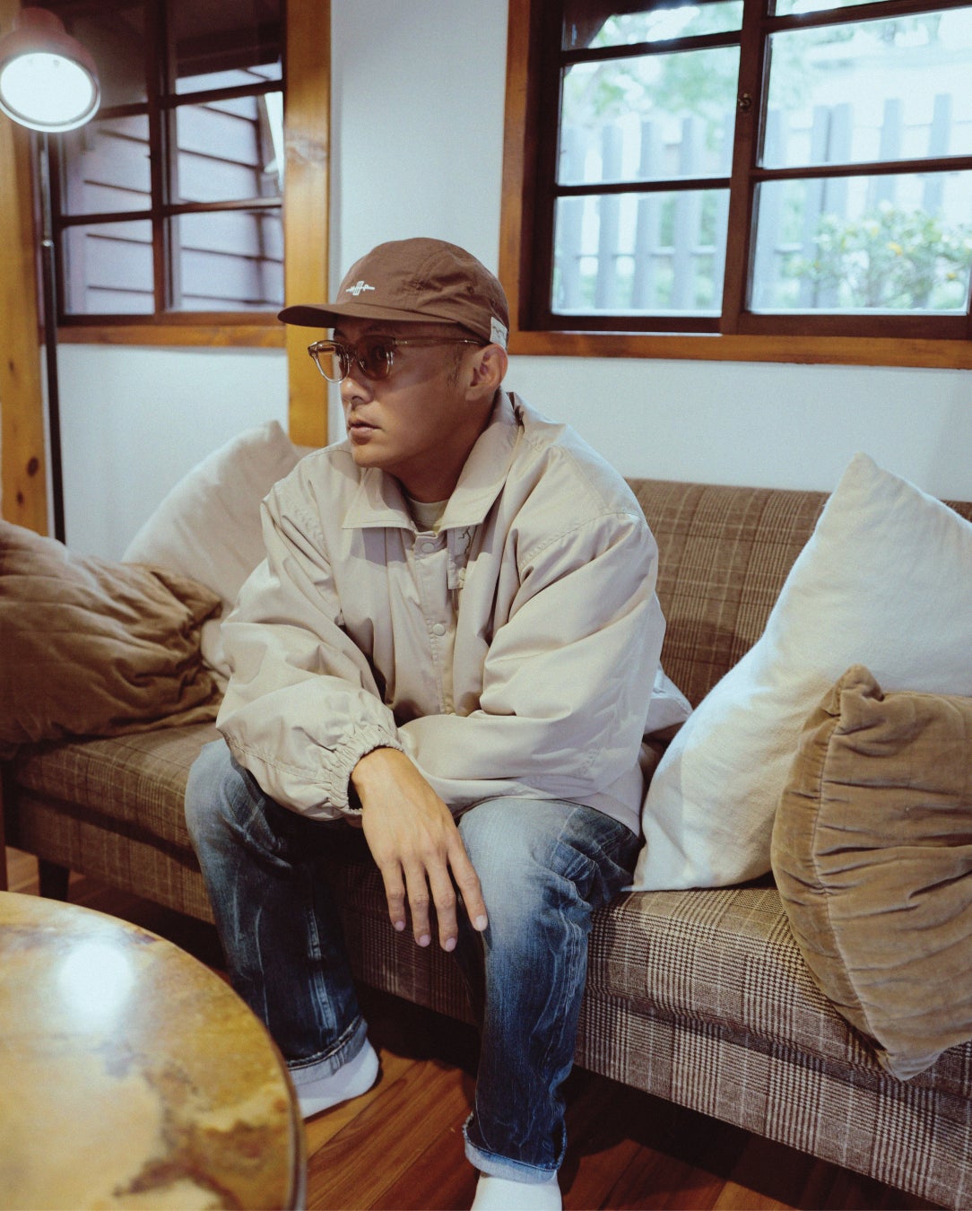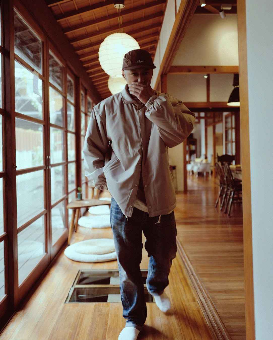 今回のコレクションでは、トリプルネームのオリジナルロゴを配置したキャップ、ヘビーウェイトコットンを使用したミニマルなデザインのTシャツ、撥水加工を施したコーチジャケットを展開。サイドシームには、リネン製のオリジナルラベルを添えることで、さりげないアクセントとブランドのアイデンティティを表現しています。