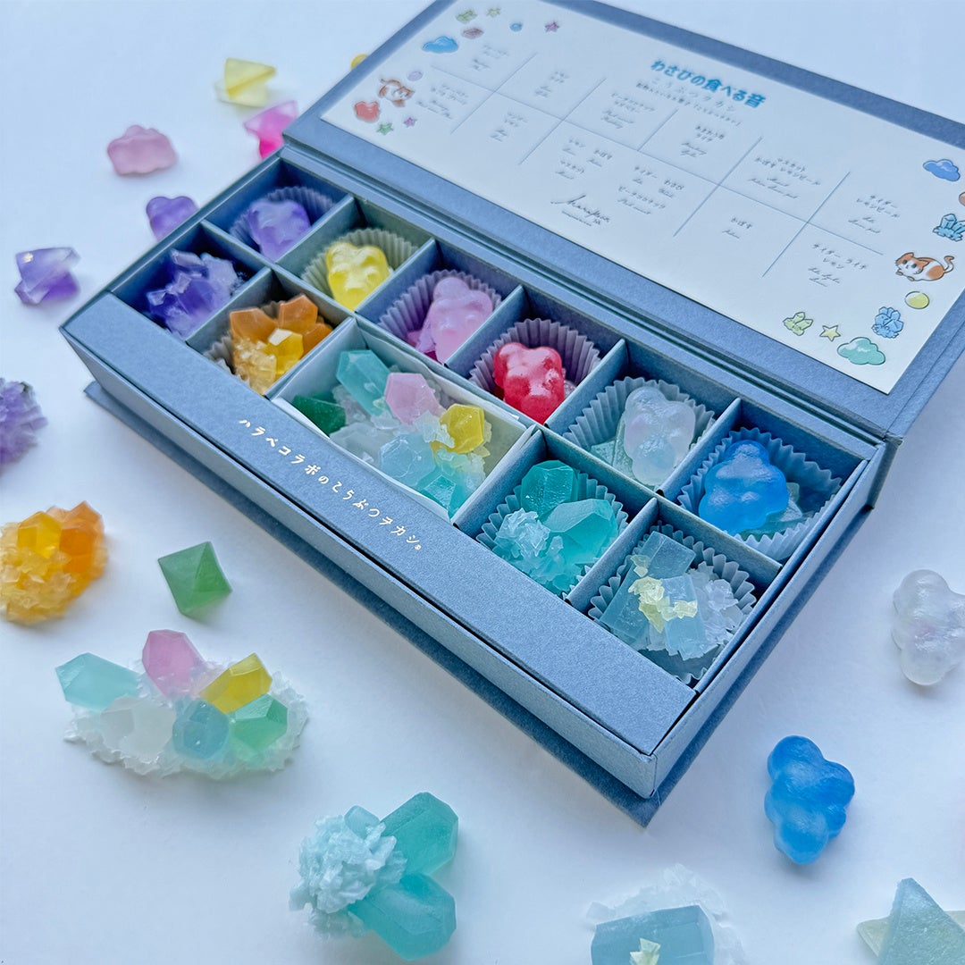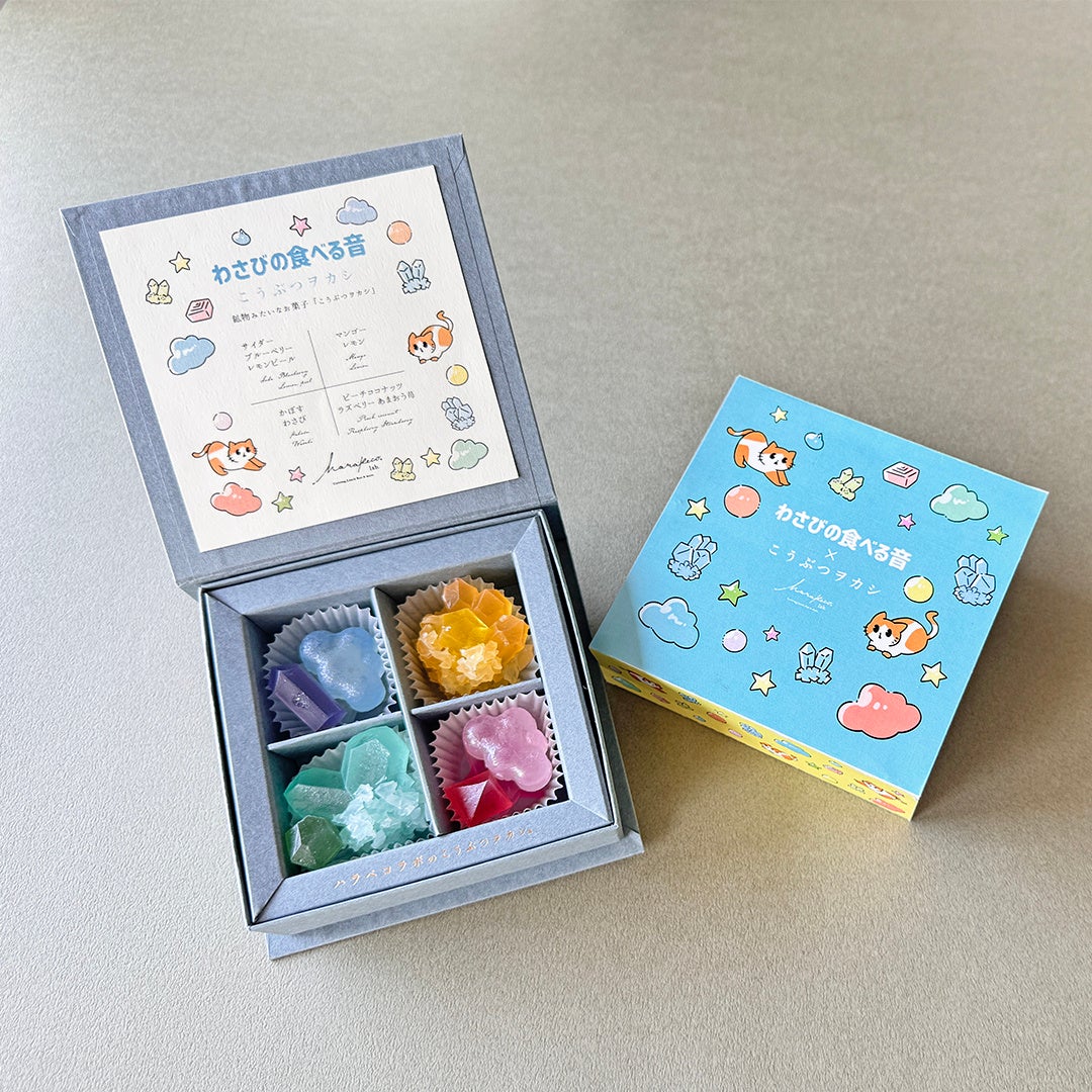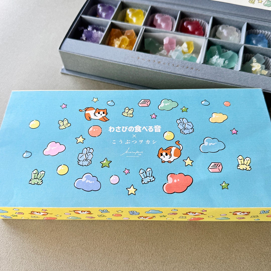 大人気ASMR Youtubeチャンネル「わさびの食べる音」のカラフルな世界観をこうぶつヲカシで表現した一箱です。