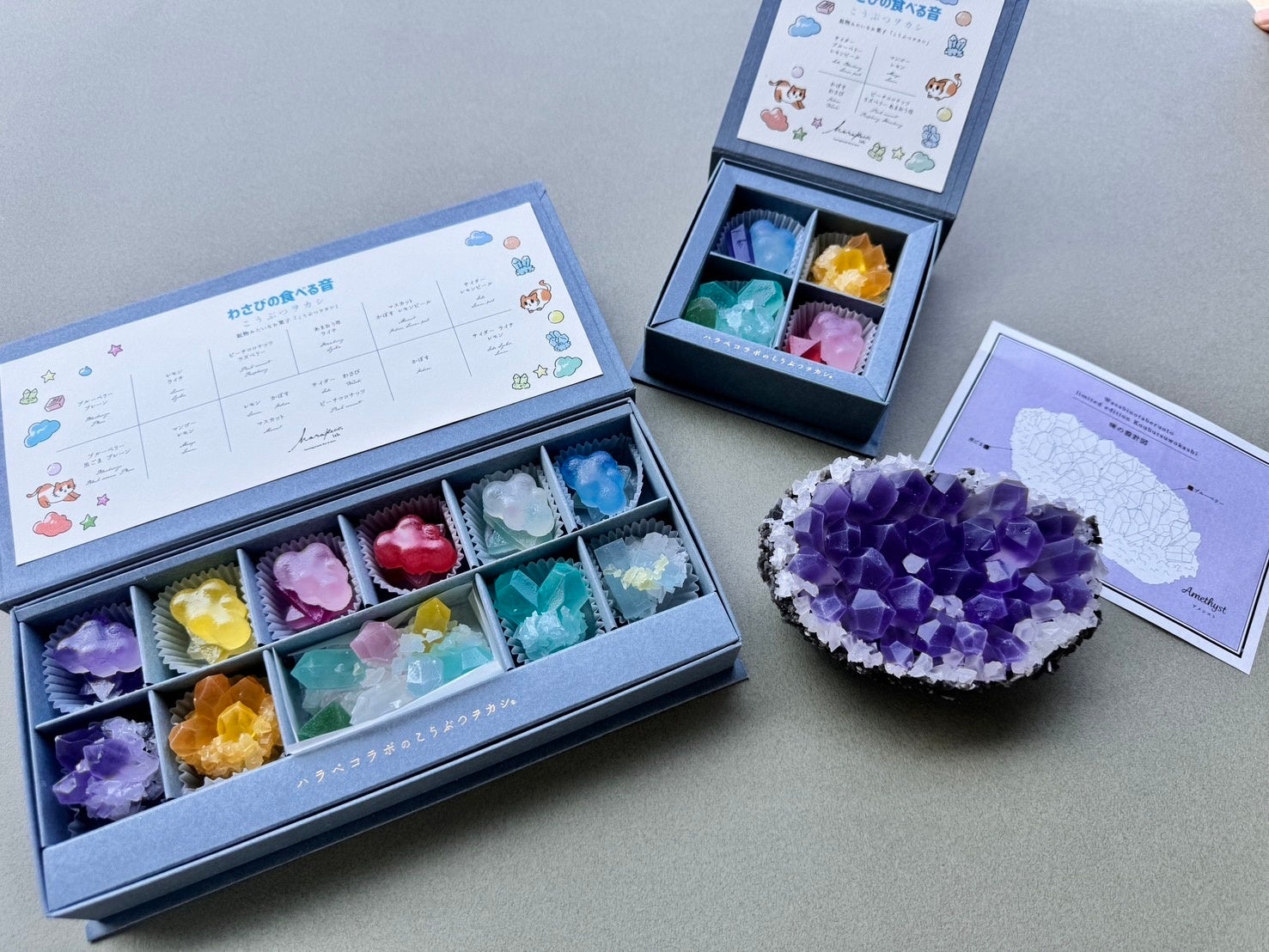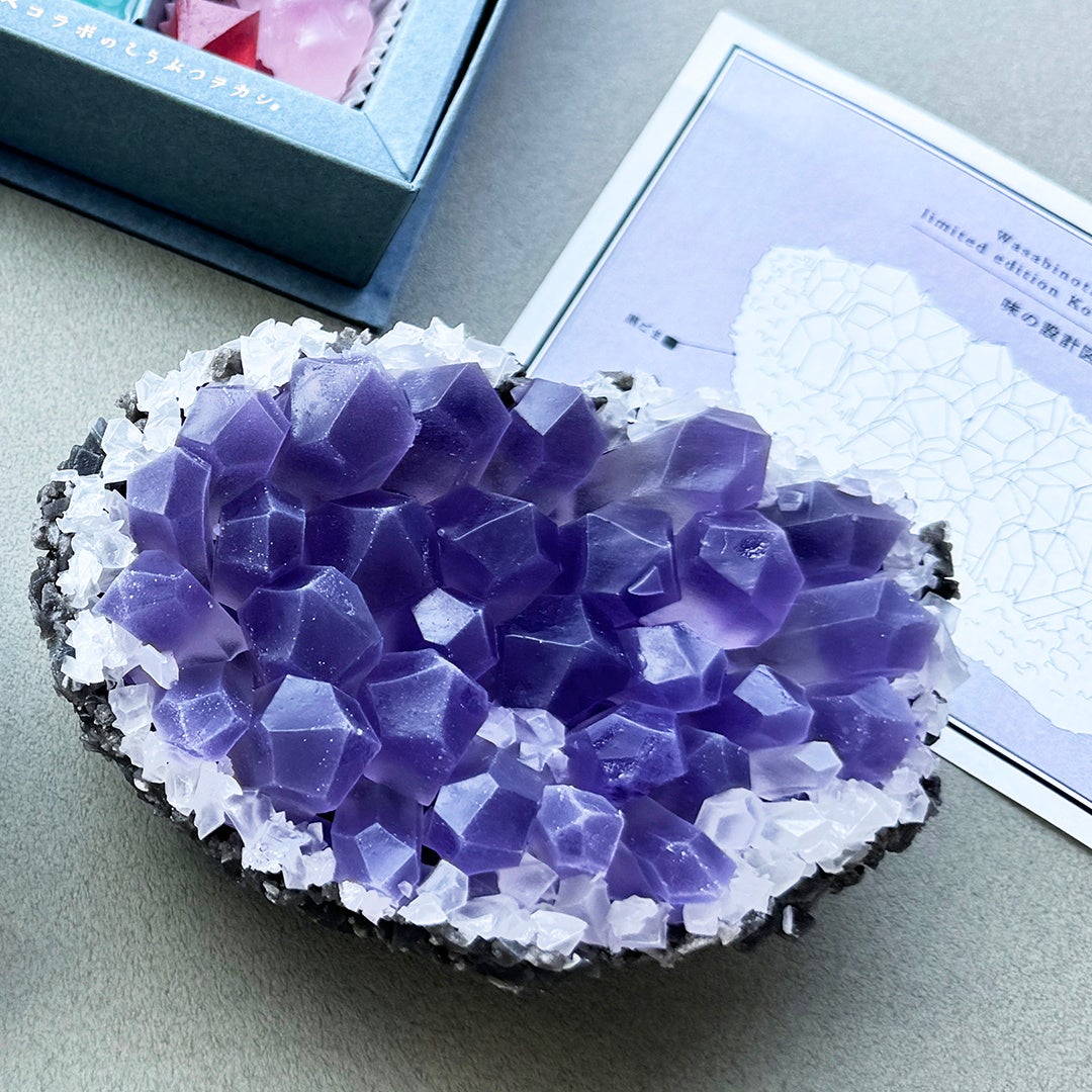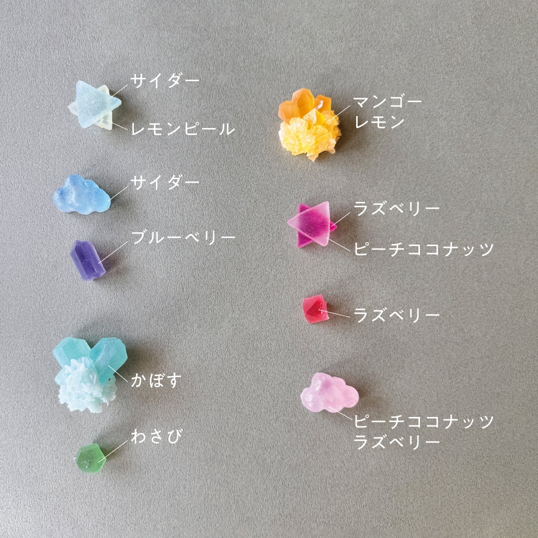 カラフル水晶・・・マスカット味の母岩に、サイダー、かぼす、ピーチココナッツ、レモン味がカラフルなスペシャルBOX限定の特別なデザインです。水晶の脇に添えた緑色の蛍石は、なんと、わさび味の琥珀糖!