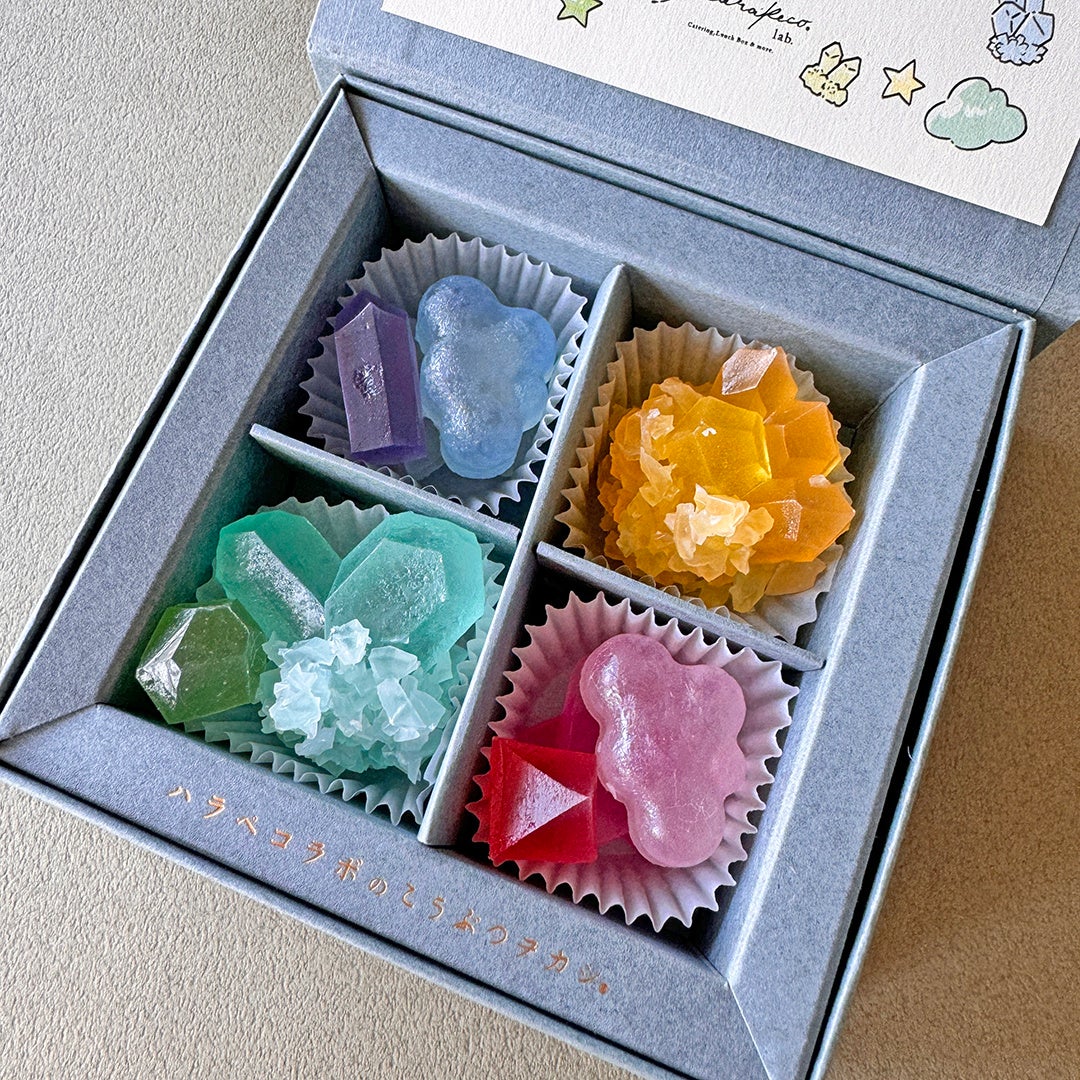 「ArtなFoodであそぶ」をコンセプトに、代表作鉱物みたいなお菓子「こうぶつヲカシ」(琥珀糖)をはじめ、宝石を散りばめたようアイスケーキ「宝石のカッサータ」やオリジナルグッズを展開。食とアートを気軽に楽しみ、日常に驚きと感動のある世界を目指して福岡で活動している会社です。2020年にはハラペコラボ ミュージアムショップ&カフェをオープン。ランチやスイーツを楽しめるカフェを併設した店舗でお菓子やオリジナルグッズを販売しており、その隣にはアトリエを構えています。