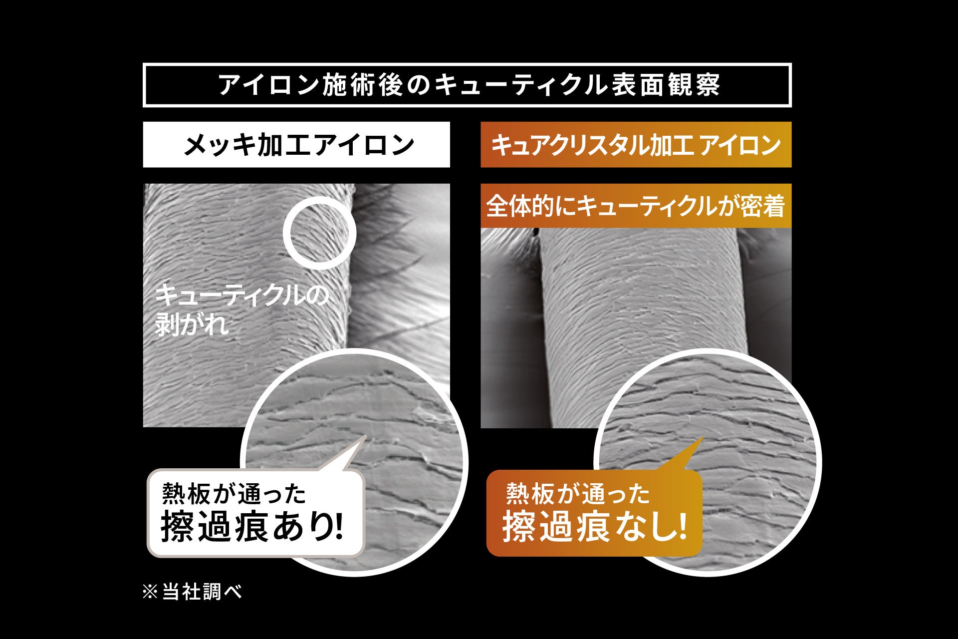 潤滑性が高く、キューティクルを傷めずにスタイリングが可能。また、特殊加工されたアイロンプレート*から発せられる「テラヘルツ波(育成光線)」による皮膜形成効果で、キューティクルを引き締め、ツヤのある美しい髪へと導きます。