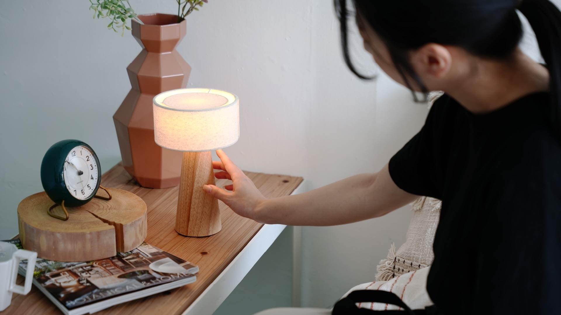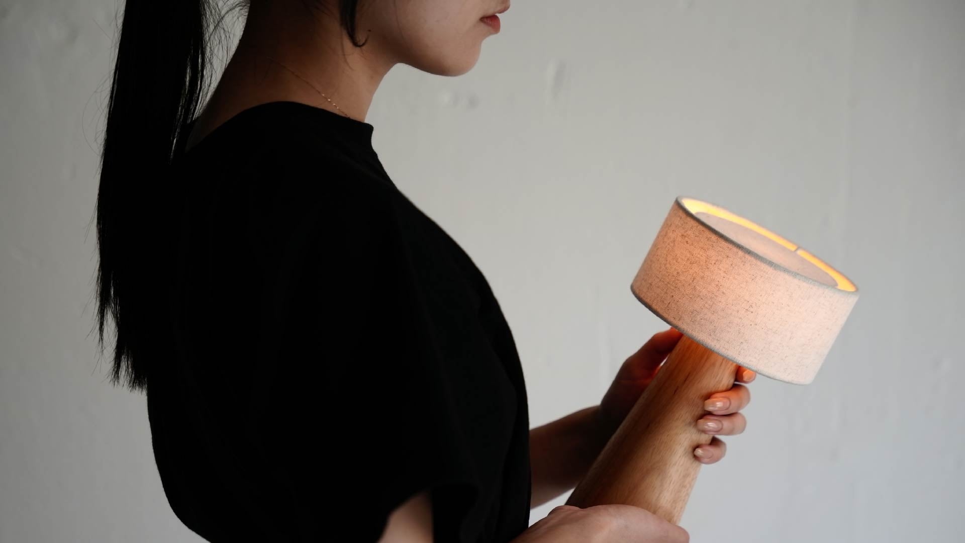 木部には天然木(ラバーウッド)を用い、色味や木目が美しいものだけを厳選。丸みのあるフォルムは、手のひらで包みたくなるような安心感と、やさしい光の広がりを生み出す設計です。スイッチや充電ポートは背面に配置し、前面からは木の質感だけが見えるようにすることで、余計な要素を排除 — 素材そのものの温かみを際立たせています。
