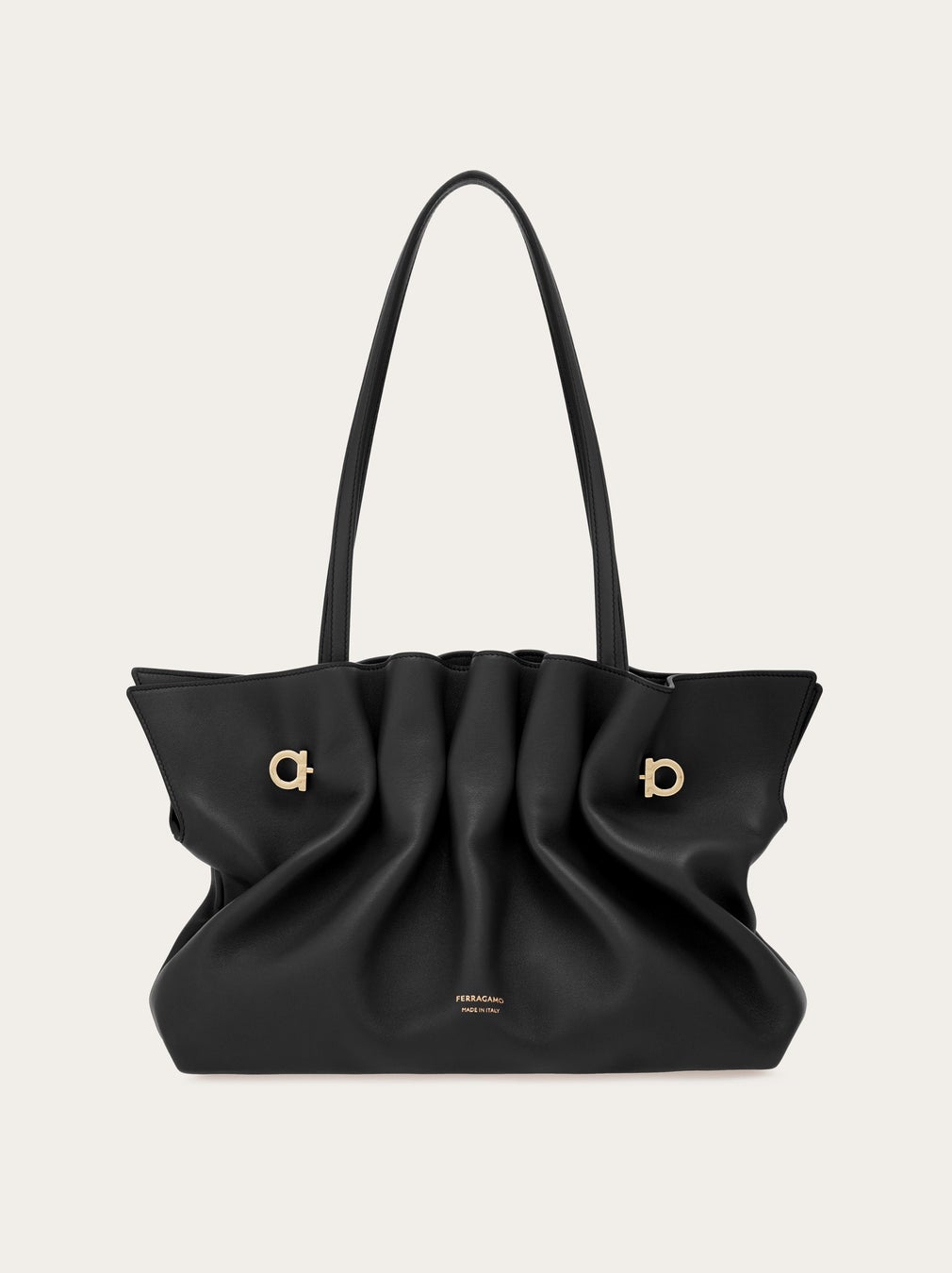 ボリュームと柔らかさ、流動性と構造性のバランスが取れたこのバッグは、光と影が織りなす陰影の中で美しい輝きを放つ。丸みを帯びたフォルムとプリーツが施されたサイドが、レザーの表面を彫刻のように引き立たせ、しなやかで流れるような美しいフォルムを生み出す。