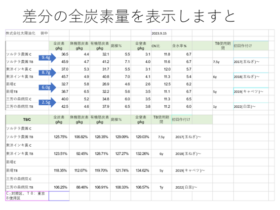 測定は茨城県つくば市の川田研究所による土壌環境測定法V.8(乾式燃焼法)によって2023年9月に測定